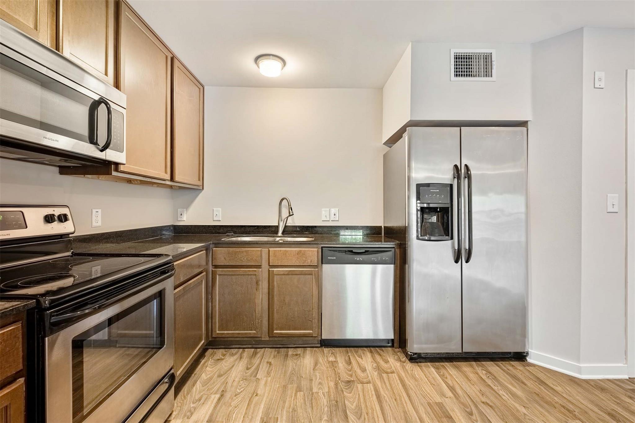 The kitchen is a culinary dream, featuring elegant granite counters that exude both beauty and functionality. Modern fixtures and high-end finishes add a touch of refinement to the space, while stainless steel appliances elevate your cooking experience to new heights.