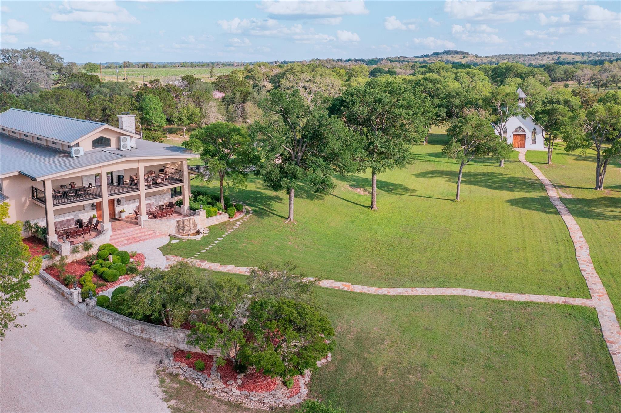This stunning destination-style wedding or corporate retreat getaway lies nestled on approximately 70+ acres of pristine Texas Hill Country. Just a short drive from downtown Fredericksburg, the impressive property and opportune business venture offers lodging, unspoiled views, a long list of quality improvements, a tranquil wet weather creek, and many more amenities. This ranch consists of 19 structures that total over an estimated 35,000 sq feet, offering the ability to host 300 people, complete with lodging for up to 90, and on-site parking for all. As an additional bonus, the property also offers approx. 4 acres of Cabernet Sauvignon vines. If there’s no interest in vine management, current owners are willing to lease land and purchase fruit for $2k/ton. All real estate, furnishings and fixtures, and business convey with the sale. Structures include restored German historic homestead (9000+ sq ft CAD), massive lodge (8700+ sq ft CAD with 15 bedrooms, 15 bathrooms), open air chapel (built in 2019), luxury reception hall (8800+ sq ft CAD, built in 2019), cocktail hour pavilion (built in 2020), 8 individual cabins (built in 2019), 3 cottages (built in 2020), horse stables with above-stable apartment (perfect for foreman's quarters), skeet range lounge, warehouse for rentals/storage and lastly, dog kennels with separate runs. Other bonuses include professional trap and skeet range, wet weather creek, 60' diameter fountain, extensive landscaping, regulation horseshoe pit, custom built-in BBQ pits, outdoor basketball court and MORE. Every room in this monstrously sized property has been extensively curated with up-scale and unique furniture and art, all of which conveys, creating a turnkey opportunity for the next owner. This is a MUST SEE to understand the magnitude of this ranch! Property booklet describing each structure and amenity is also available.