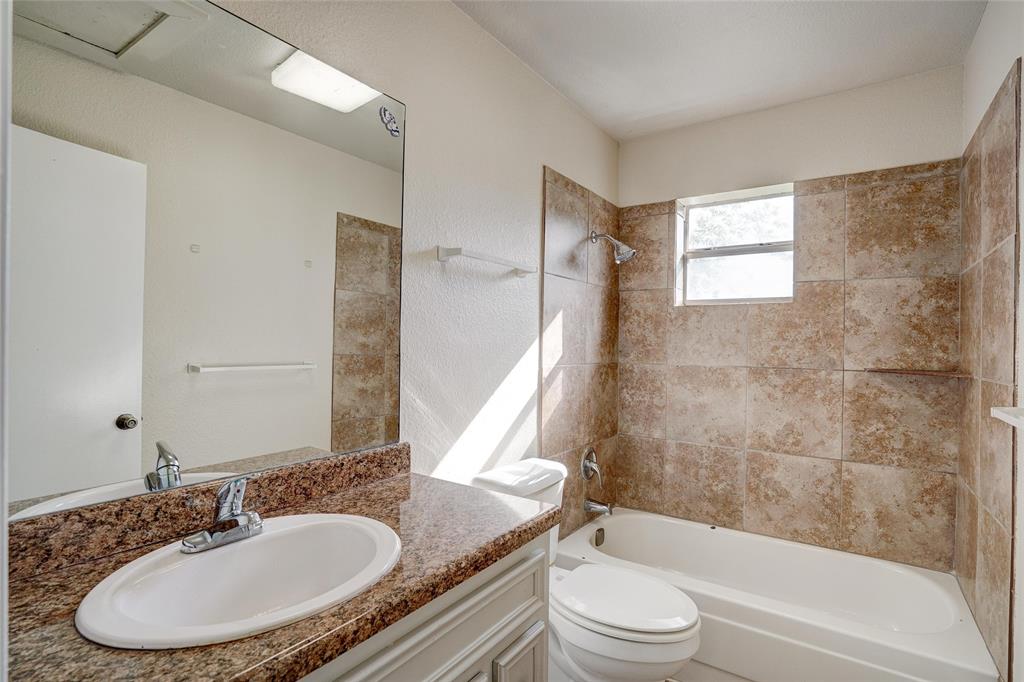 The bathroom features a single vanity and a built-in tub/shower.