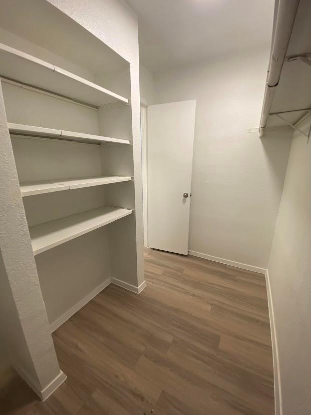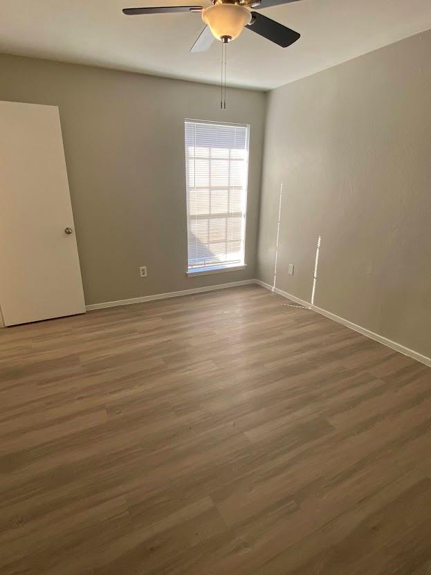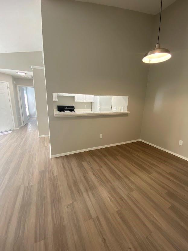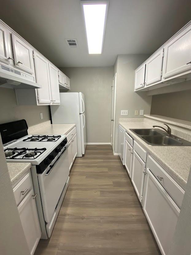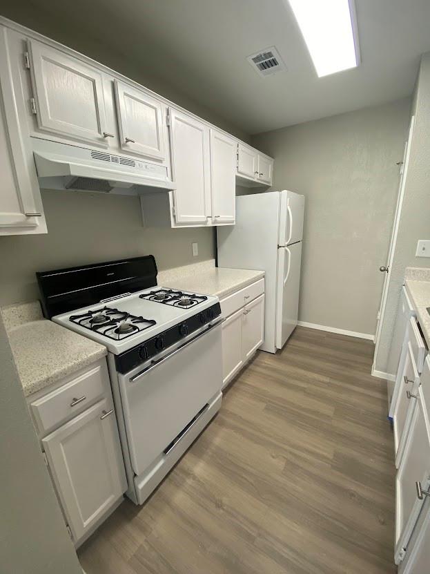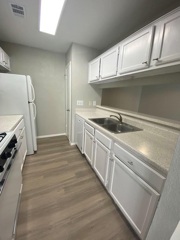Great roommate-style floorplan 2 bed 2 bath with fresh and updated paint and cabinets! Vinyl flooring throughout, NO CARPET! Back yard faces a tree area. The garage has an extra storage area and a long driveway.
