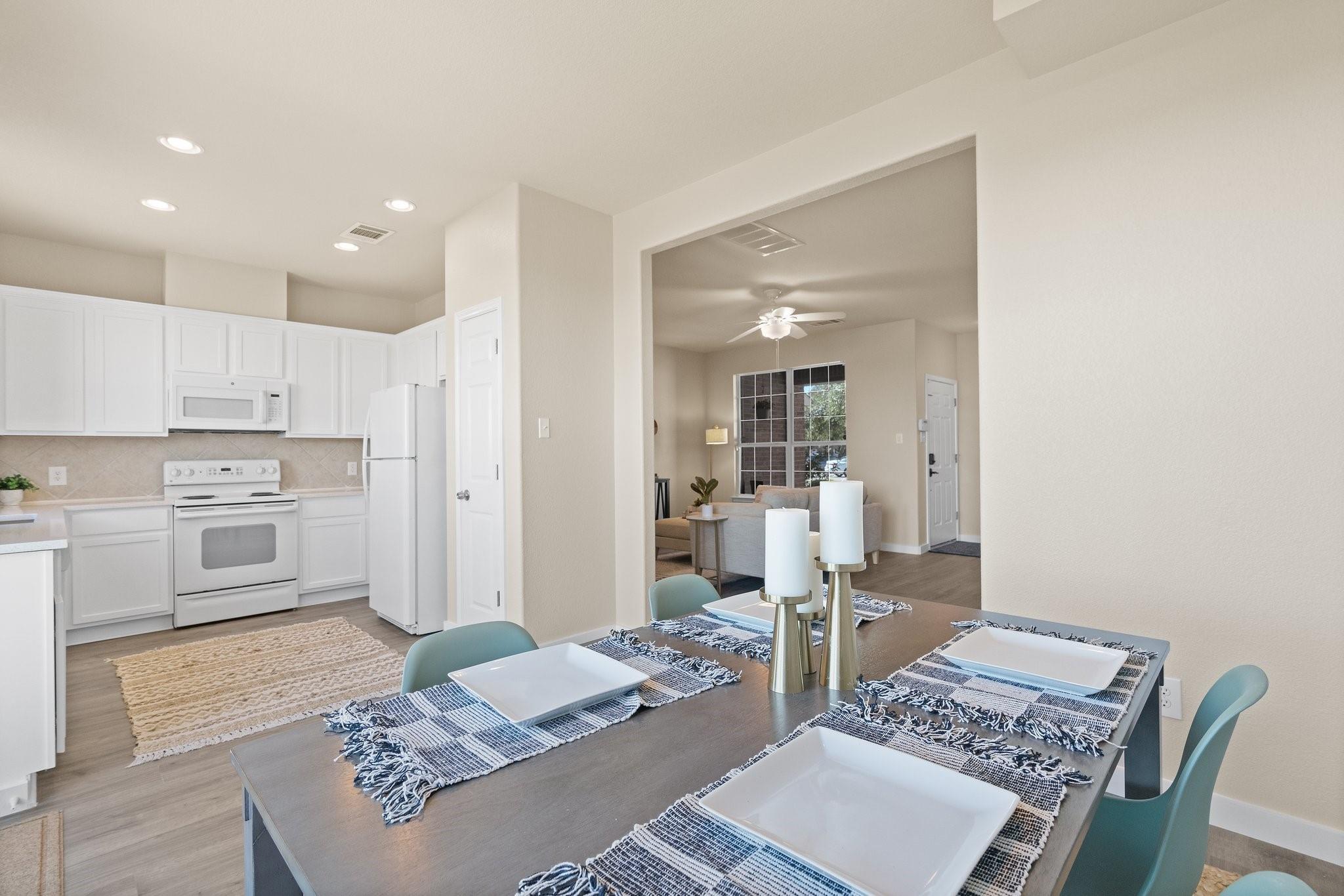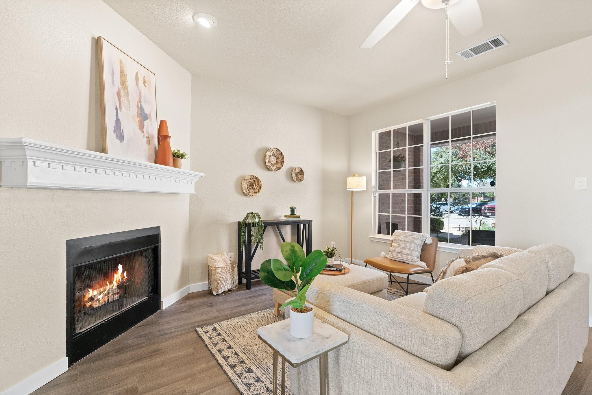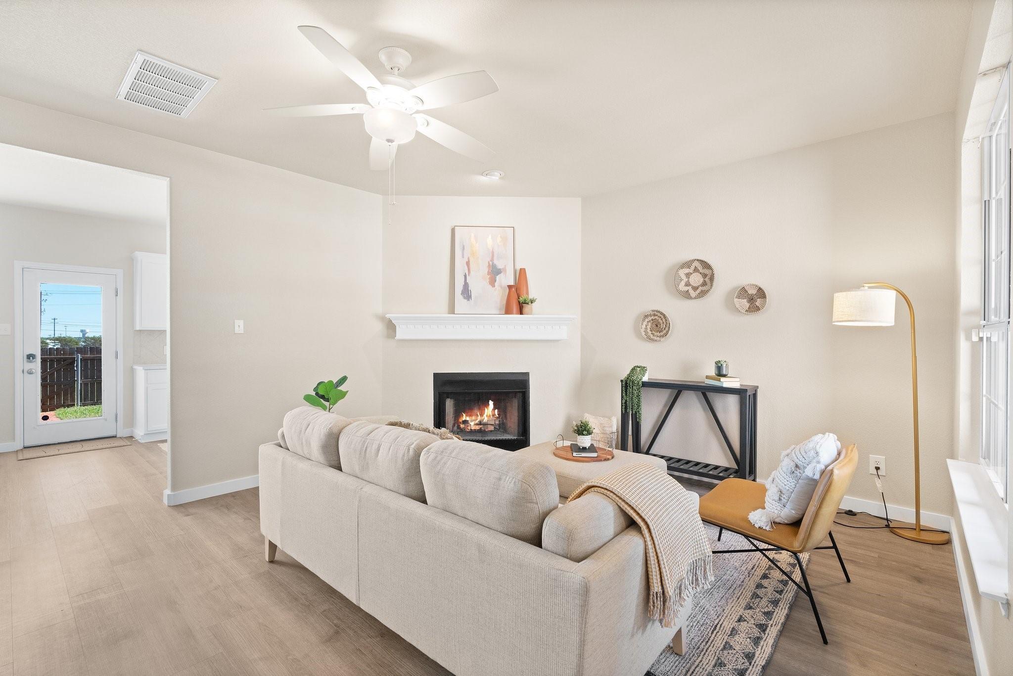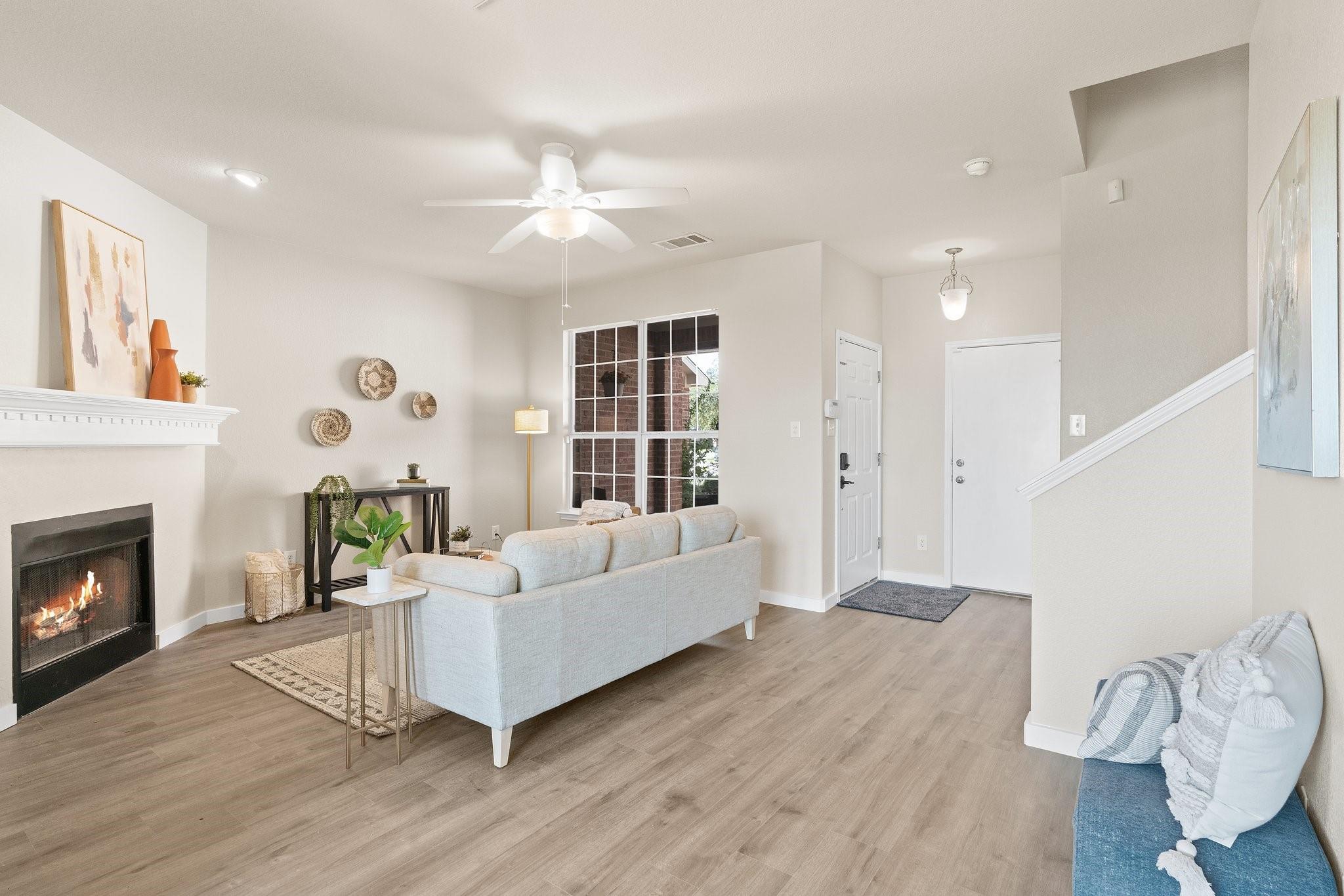 Nestled within the gated Lakeline Ranch Townhomes, this renovated gem is a testament to modern townhome living. Beautifully manicured landscaping maintained by the HOA The recent floor-to-ceiling renovation shines with new vinyl flooring, plush carpeting, dazzling quartz countertops, & fresh paint. The connected living, kitchen, & dining areas create an ideal setting for entertaining guests. The living room's stunning corner fireplace, elegant mantel & expansive windows create a perfect space to relax. The kitchen is a modern delight, with white Shaker cabinets, quartz countertops, & recessed lighting. Enjoy views of the backyard while you dine. Upstairs, you'll find 2 bedrooms that provide privacy & comfort. The large, light-filled primary bedroom offers a walk-in closet & en-suite bathroom with quartz countertops, beautiful fixtures, & generous soaking tub. The 2nd bedroom is equally light-filled & boasts a spacious closet & nearby bathroom. Outside, you'll find a peaceful escape in the private, fenced backyard, complete with fresh sod & garden bed. Through the gate, green space abounds, offering a quick stroll to restaurants, businesses, & Leader High. within walking distance are the community pool, playgrounds, sports courts, volleyball court, disc golf course, & more. The community exudes a calming, idyllic atmosphere with shaded walking paths that wind through green spaces. Convenience is at your doorstep with Highway 183, Gateway Shopping Center, HEB, Costco, Cedar Park Regional Medical Center & more. Buyer to verify all information. IS A REQUIRED PART OF THE APPLICATION PROCESS FOR ALL APPLICANTS: A welcoming environment is paramount to all of our residents with or without pets as well as animals. To help ensure ALL of our residents understand our pet and animal-related policies, we use a third-party screening service and require EVERYONE to complete a profile.