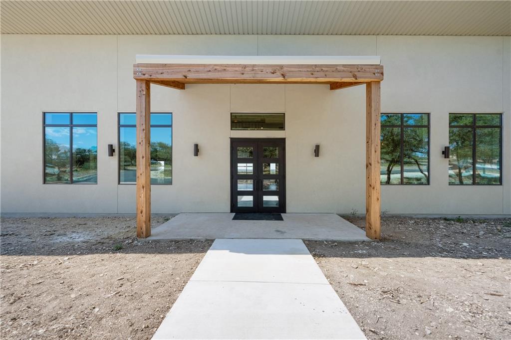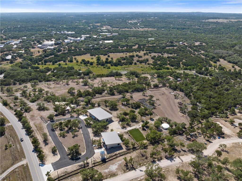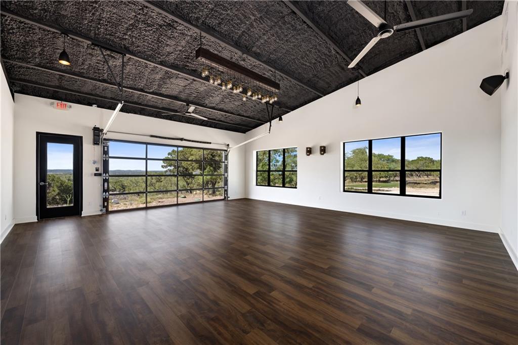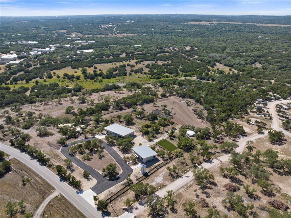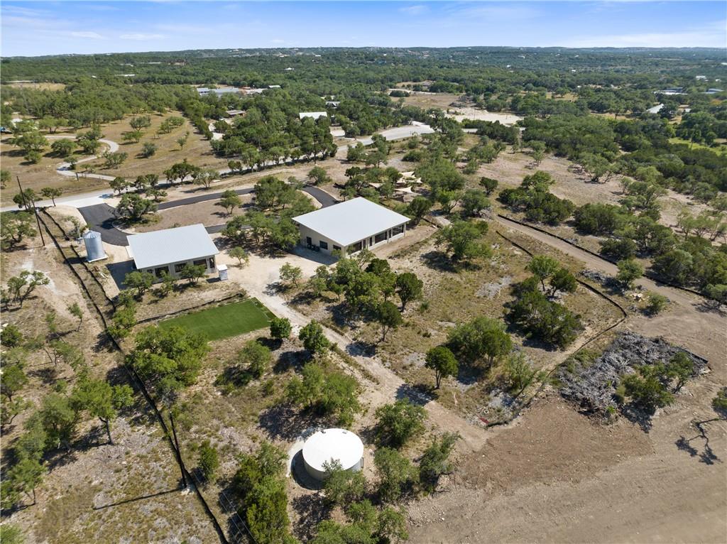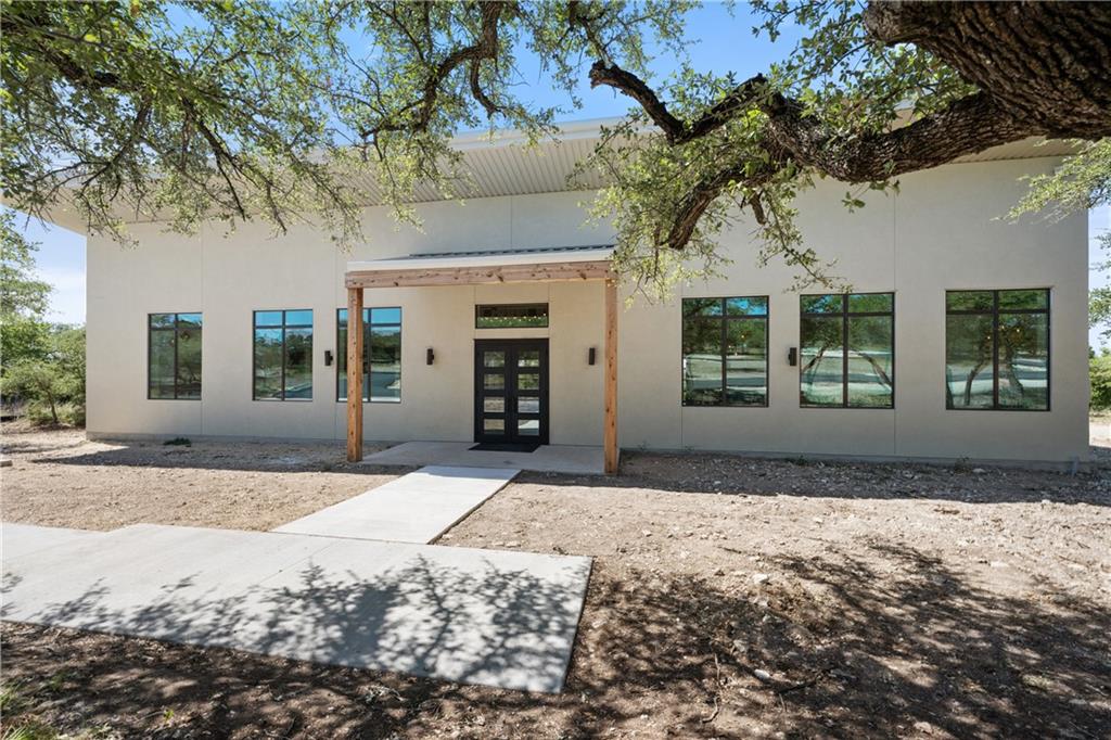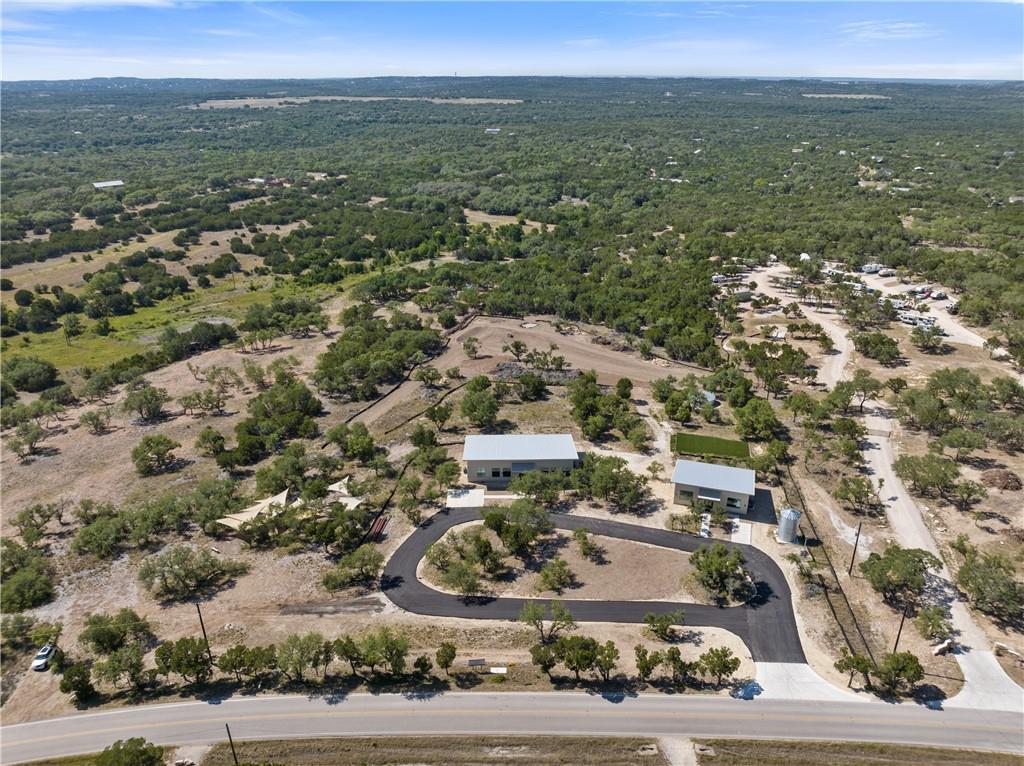 Long distance sunset views in an outstanding location! Fabulous 10 acres in the middle of Fitzhugh Row right across the street from Jester King Brewery. Come see your wedding venue, tasting room, spa retreat center- the possibilities are endless. Two steel buildings, with stucco facades both nestled into the trees with views for days. Both buildings feature stupendous views out the back seen through ample windows and motorized garage doors made of glass that bring the beautiful hill country views inside. The larger building is 4,000 sq ft and features 3 separate rooms, with a lobby, 3 full restrooms, two showers, a prep kitchen with gas range, washer/dryer combo, sink and fridge. The lobby has a 10 ft counter with a hammered copper sink, a custom 3 fountain water wall and custom lighting throughout, made from large oak branches that came from the property. All counters in kitchen and bathrooms have black leathered granite and showers have black basalt tiles 8’ up the walls. All floors are vinyl plank with 15-year commercial warranty. There is a 4-zone audio system with Bluetooth and mic panels in each of the three rooms and all rooms are separated by enormous double barn doors including from the central room to the lobby allowing for the whole place to be opened up or separated into any combination. The second building is 2,000 sq ft and really just one large open space with a front counter, two bathrooms, and a storage room. There is also a large artificial turf installation 2400 sq ft directly behind the smaller building. A 30,000-gallon rainwater tank connects both buildings with a possible 140,000 gallons that can be caught per year from the average rainfall in the area.