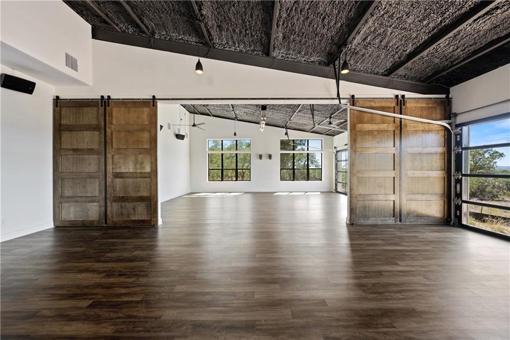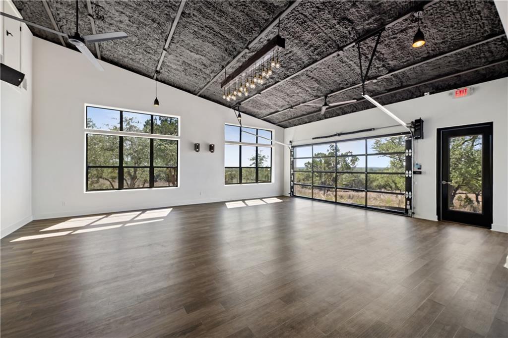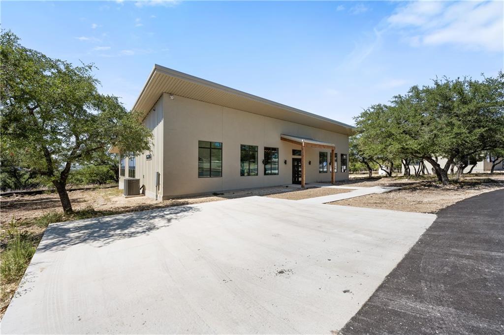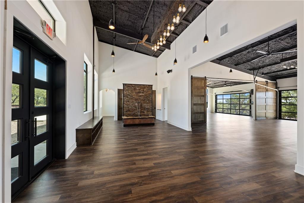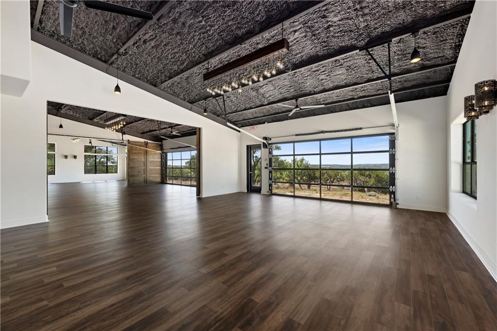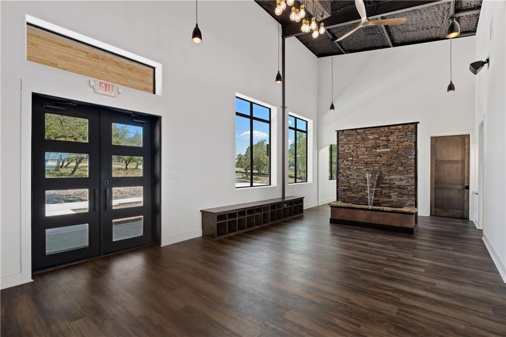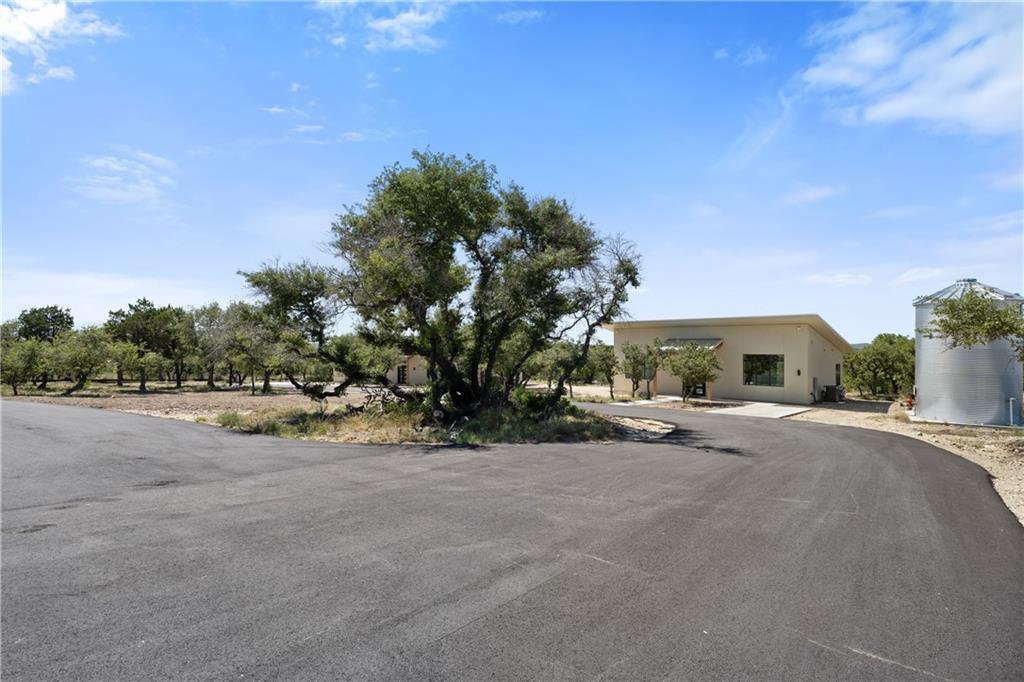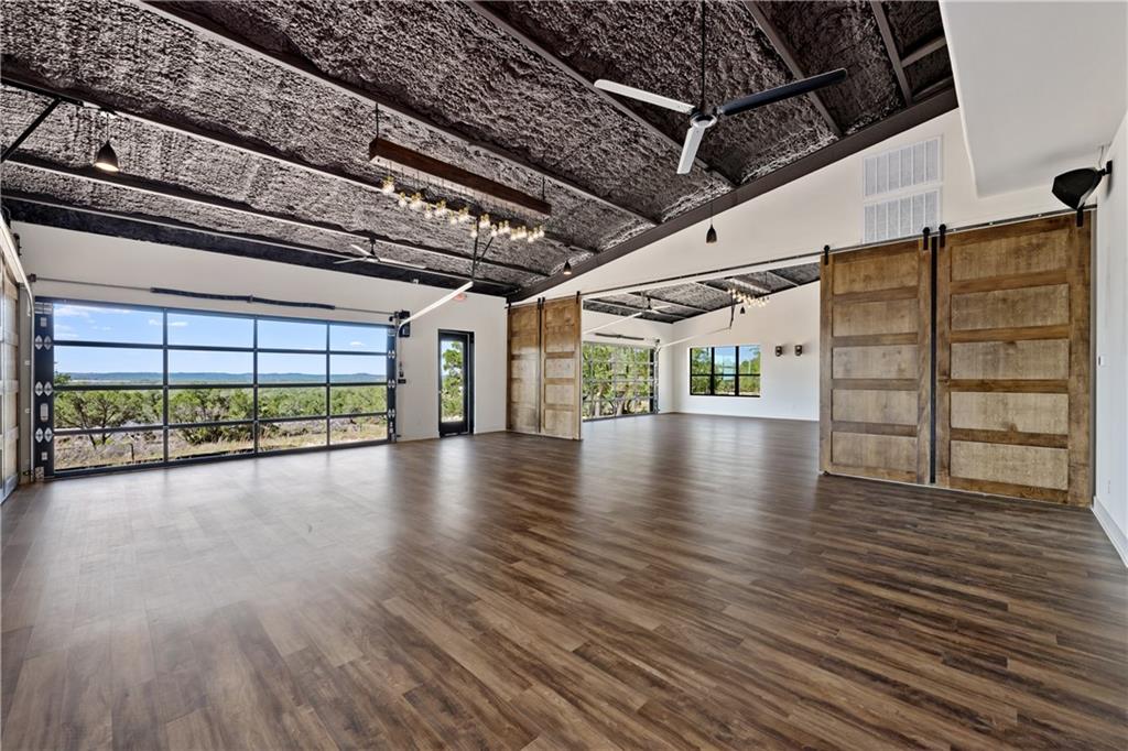 Long distance sunset views in an outstanding location! Fabulous 10 acres in the middle of Fitzhugh Row right across the street from Jester King Brewery. Come see your wedding venue, tasting room, spa retreat center- the possibilities are endless. Two steel buildings, with stucco facades both nestled into the trees with views for days. Both buildings feature stupendous views out the back seen through ample windows and motorized garage doors made of glass that bring the beautiful hill country views inside. The larger building is 4,000 sq ft and features 3 separate rooms, with a lobby, 3 full restrooms, two showers, a prep kitchen with gas range, washer/dryer combo, sink and fridge. The lobby has a 10 ft counter with a hammered copper sink, a custom 3 fountain water wall and custom lighting throughout, made from large oak branches that came from the property. All counters in kitchen and bathrooms have black leathered granite and showers have black basalt tiles 8’ up the walls. All floors are vinyl plank with 15-year commercial warranty. There is a 4-zone audio system with Bluetooth and mic panels in each of the three rooms and all rooms are separated by enormous double barn doors including from the central room to the lobby allowing for the whole place to be opened up or separated into any combination. The second building is 2,000 sq ft and really just one large open space with a front counter, two bathrooms, and a storage room. There is also a large artificial turf installation 2400 sq ft directly behind the smaller building. A 30,000-gallon rainwater tank connects both buildings with a possible 140,000 gallons that can be caught per year from the average rainfall in the area.