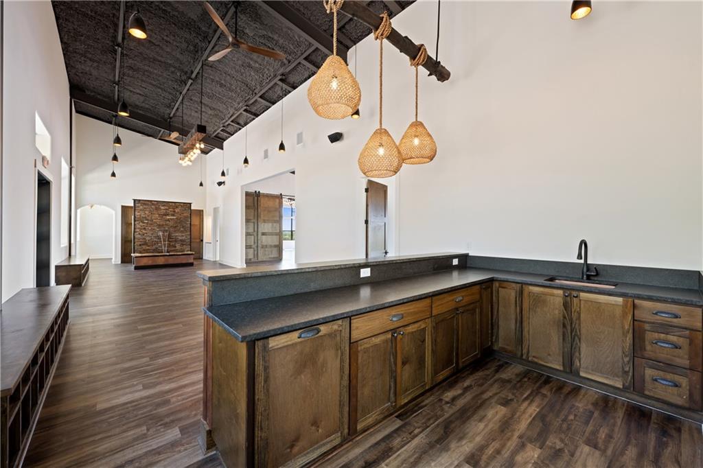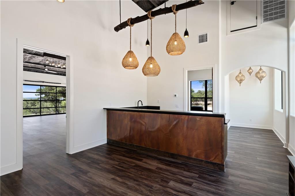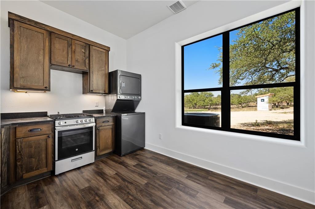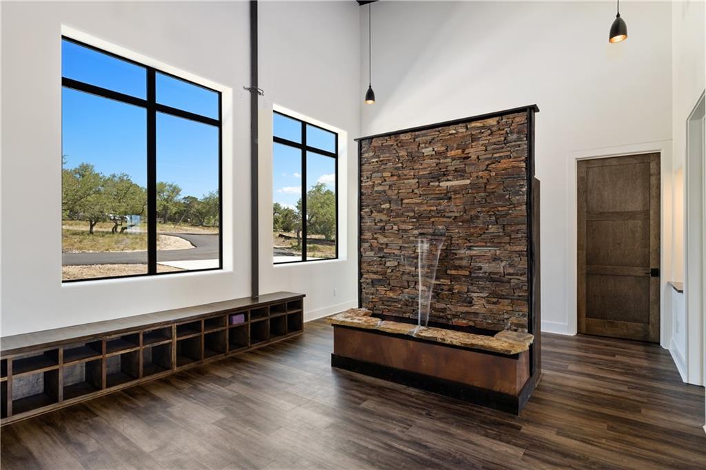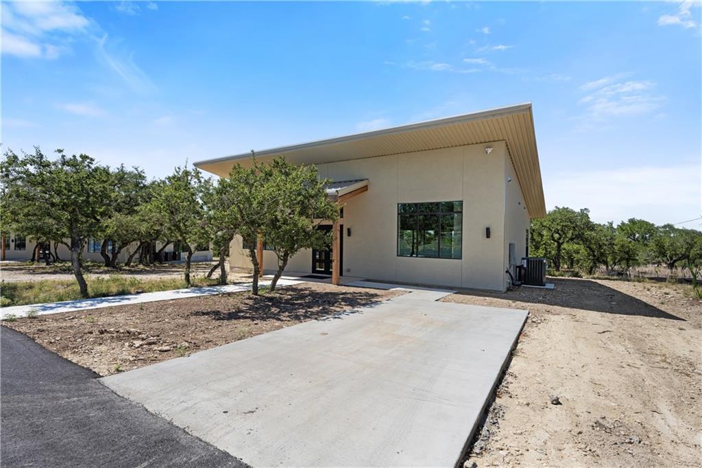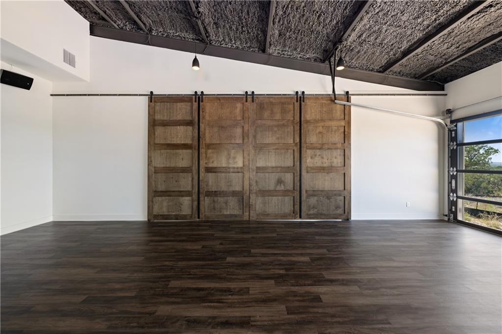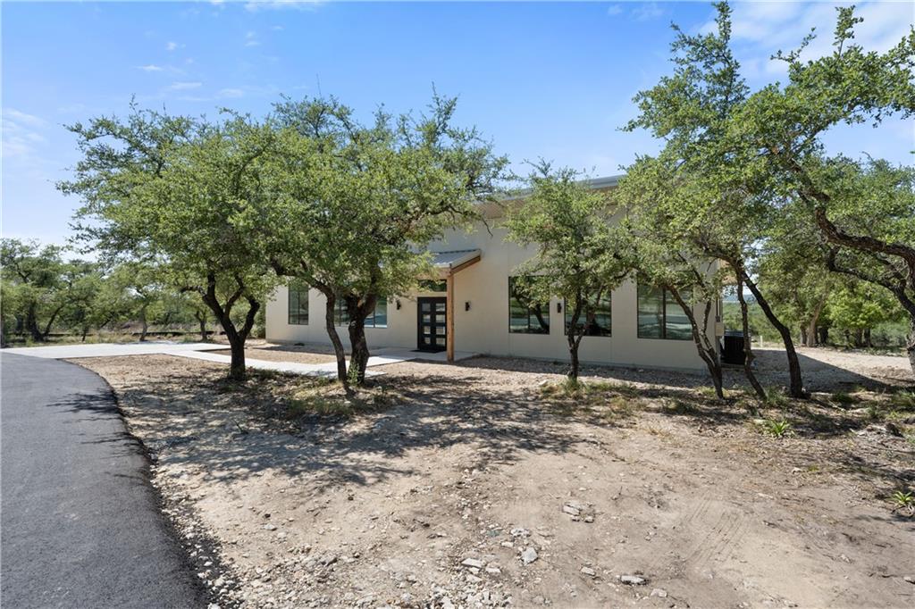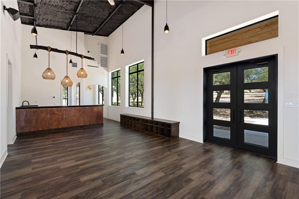 Long distance sunset views in an outstanding location! Fabulous 10 acres in the middle of Fitzhugh Row right across the street from Jester King Brewery. Come see your wedding venue, tasting room, spa retreat center- the possibilities are endless. Two steel buildings, with stucco facades both nestled into the trees with views for days. Both buildings feature stupendous views out the back seen through ample windows and motorized garage doors made of glass that bring the beautiful hill country views inside. The larger building is 4,000 sq ft and features 3 separate rooms, with a lobby, 3 full restrooms, two showers, a prep kitchen with gas range, washer/dryer combo, sink and fridge. The lobby has a 10 ft counter with a hammered copper sink, a custom 3 fountain water wall and custom lighting throughout, made from large oak branches that came from the property. All counters in kitchen and bathrooms have black leathered granite and showers have black basalt tiles 8’ up the walls. All floors are vinyl plank with 15-year commercial warranty. There is a 4-zone audio system with Bluetooth and mic panels in each of the three rooms and all rooms are separated by enormous double barn doors including from the central room to the lobby allowing for the whole place to be opened up or separated into any combination. The second building is 2,000 sq ft and really just one large open space with a front counter, two bathrooms, and a storage room. There is also a large artificial turf installation 2400 sq ft directly behind the smaller building. A 30,000-gallon rainwater tank connects both buildings with a possible 140,000 gallons that can be caught per year from the average rainfall in the area.