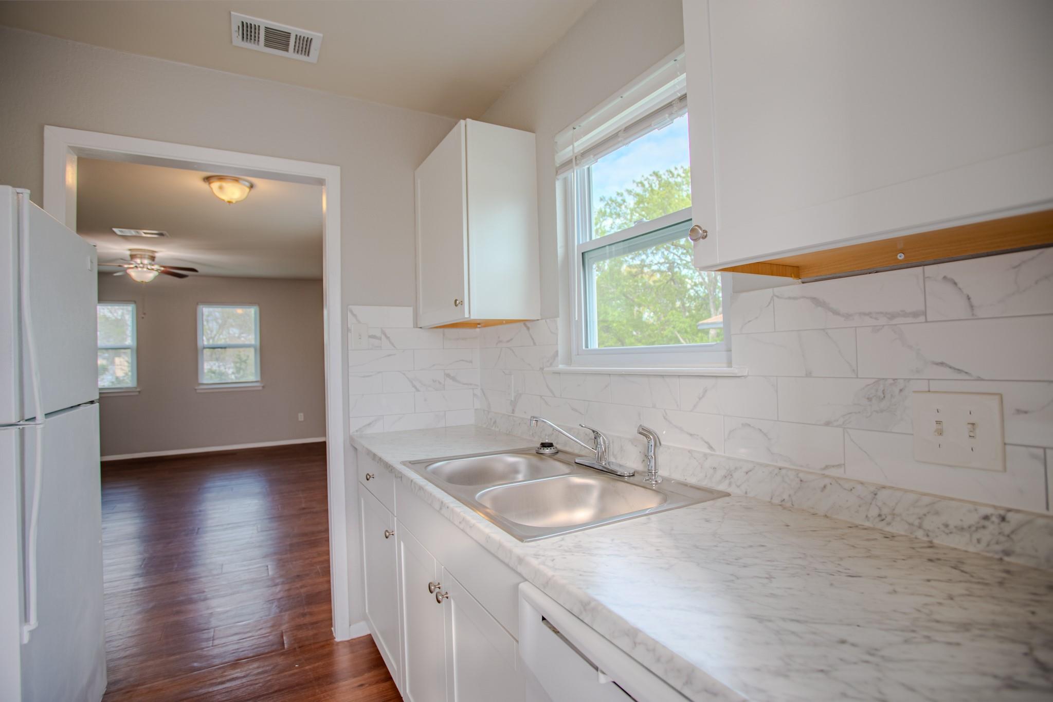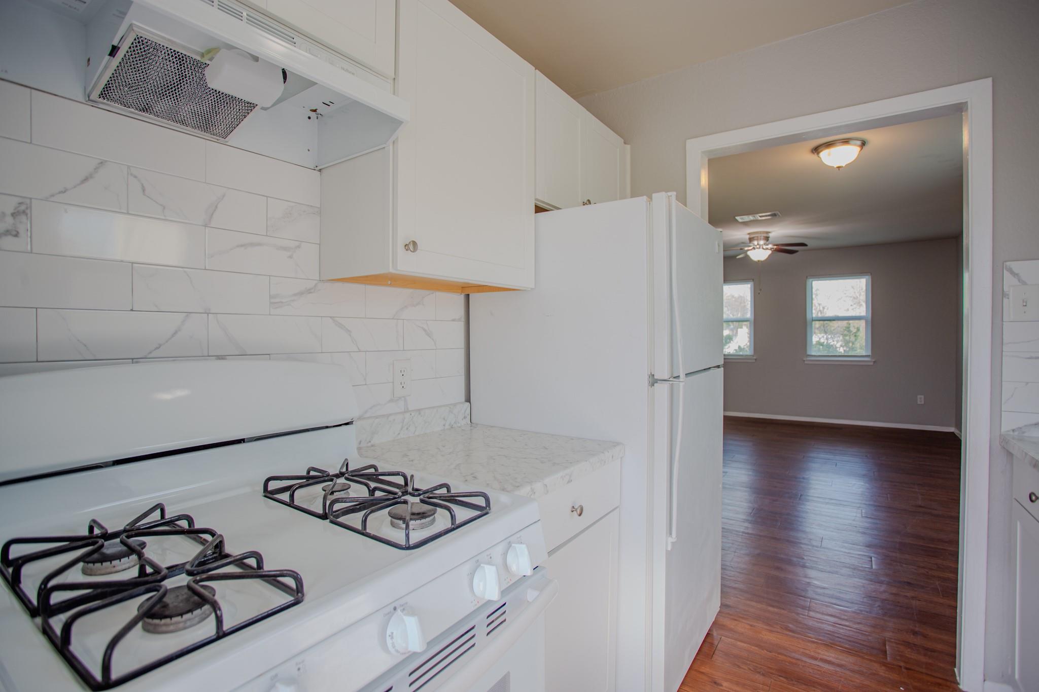 Don't miss your chance to live in the best home on the street! It's hard to beat this quality at this low price point. This charming, 2nd-floor duplex unit has just been remodeled with new floors, paint, and laminate counter tops. The full bathroom has a soaking tub, and porcelain shower wall. The large living room has a wood-burning fireplace, and the galley kitchen has gas appliances (and a refrigerator conveying). The unit has a 1-car garage, and fully-private back yard with a 6-ft wood fence. Pets allowed with landlord approval. Front yard maintained by the local landlord. See video for home tour, or schedule one today!
