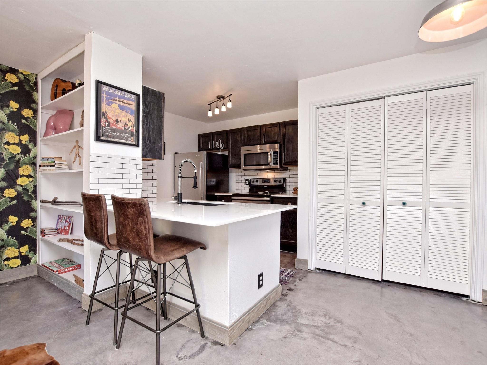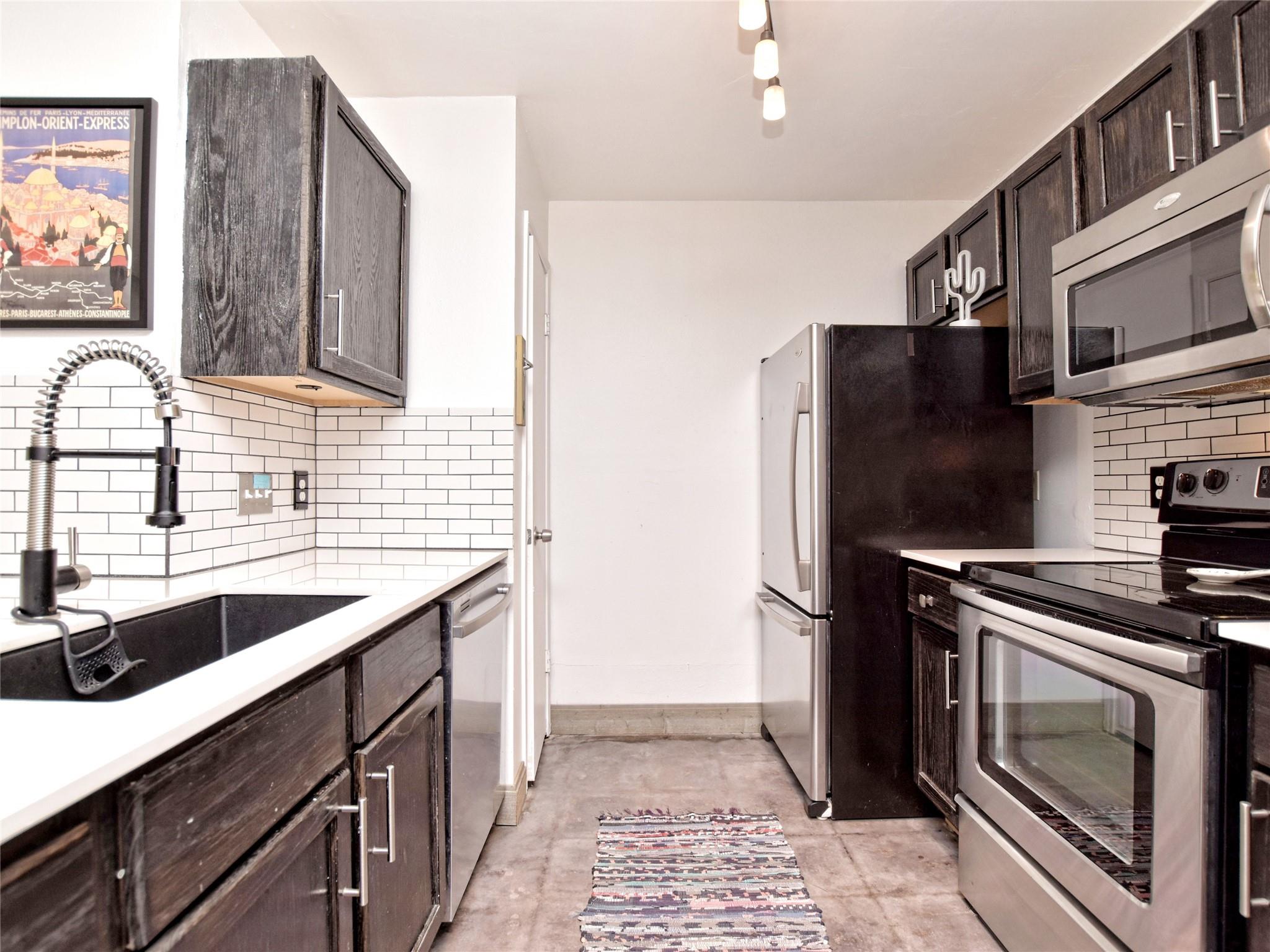 Designer style throughout, this condo has a townhome feel, and offers a 78741 location! Close to downtown, easy access to major thoroughfares, and great shopping/groceries close by! Minimal and bright, this concrete floored condo features wonderful spaces with an open feel, fantastic finishes and a great location.
