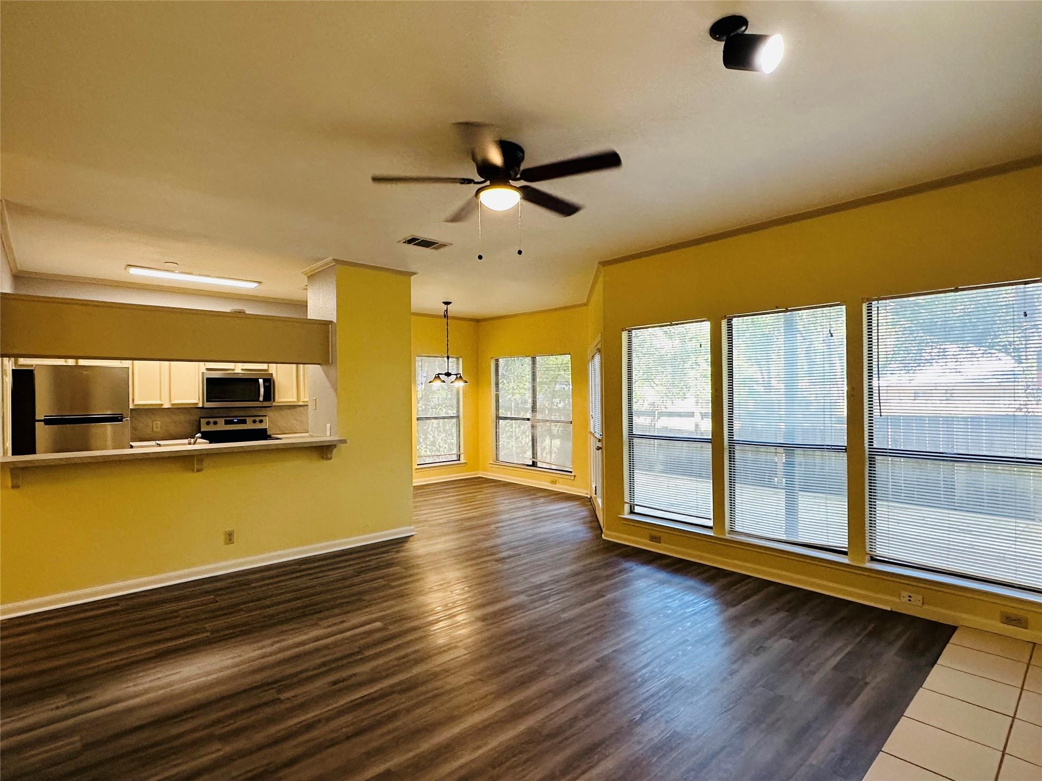 Water, sewer, and trash paid by HOA * Columbia Square Condos is a cozy little community surrounded by large Oak trees just off Jollyville Road at end of Columbia Oaks Drive * Remodeled 2 bedroom - 2 bathroom with breakfast nook * Open floorplan * High ceilings * Extended wood patio deck opens to common privacy fenced backyard hardly used by others * Utility room off kitchen * Large master walk-in closet * Fresh paint * New SS appliances and wood-like flooring * Kitchen overlooks living room with fireplace * Built-in microwave and Refrigerator * Move-in ready * Minutes to HEB, transportation, more!