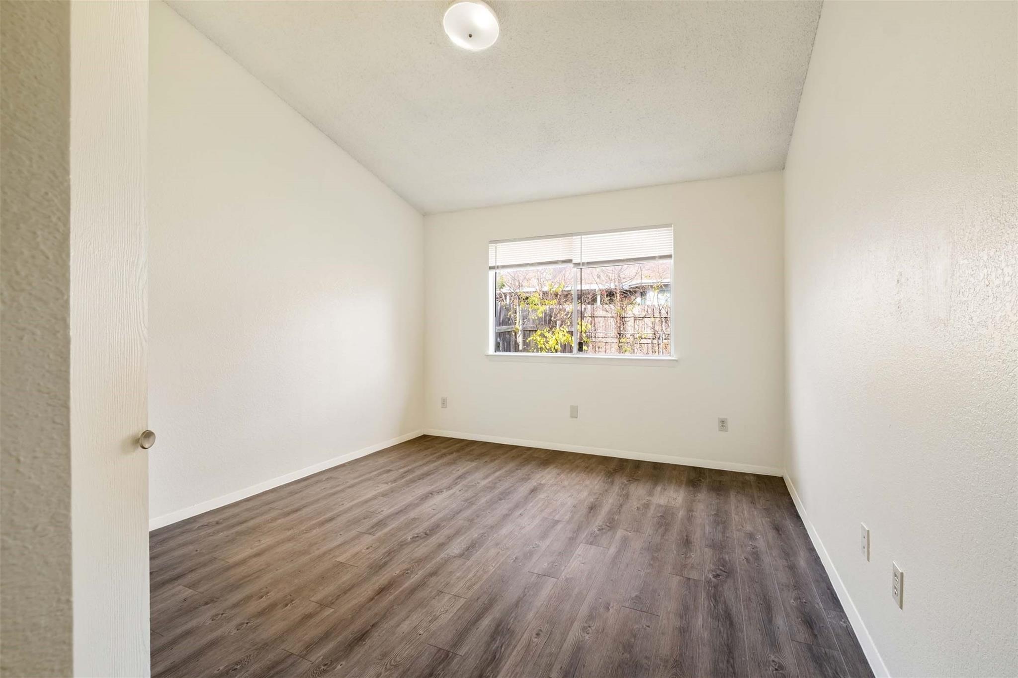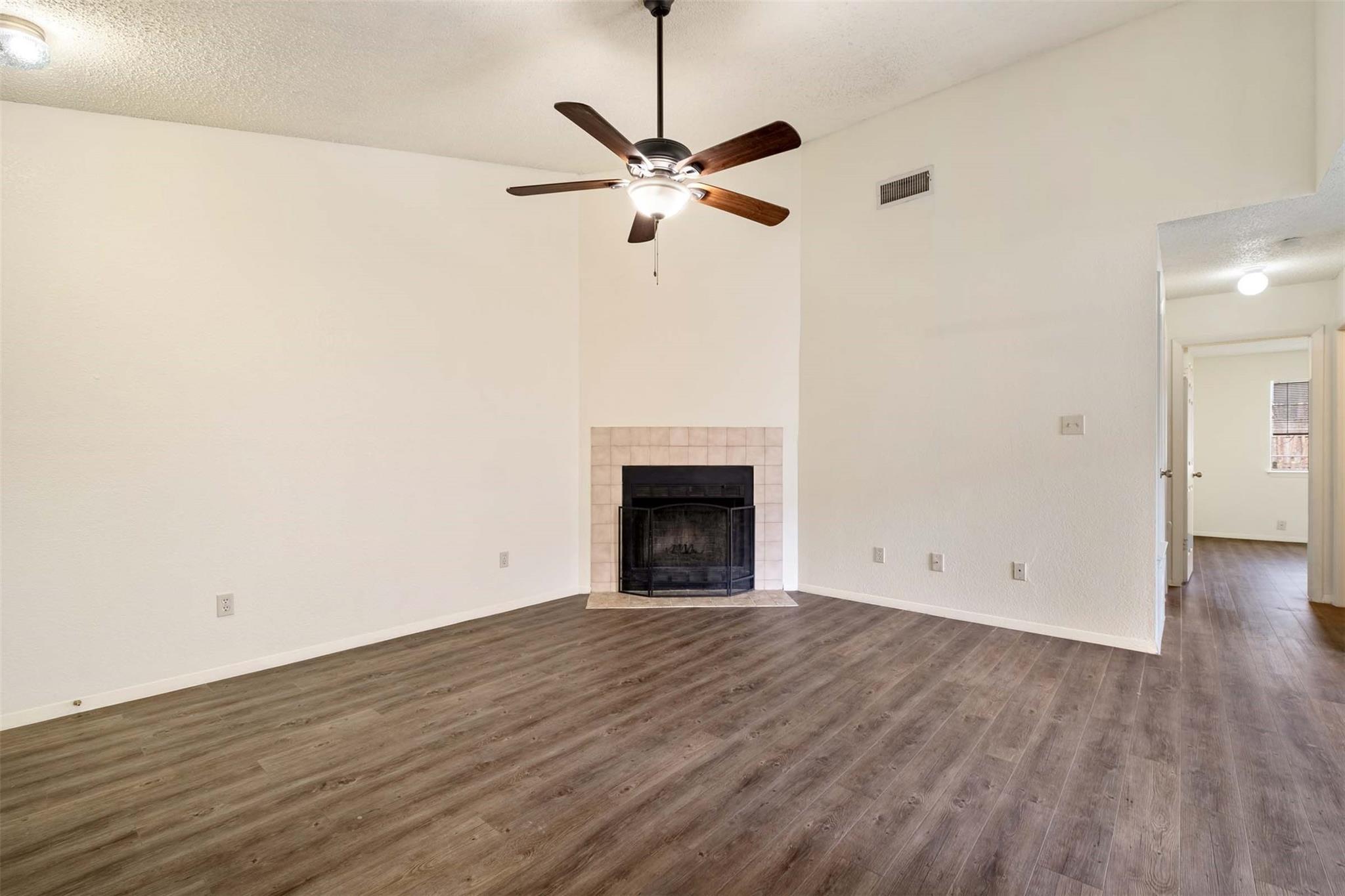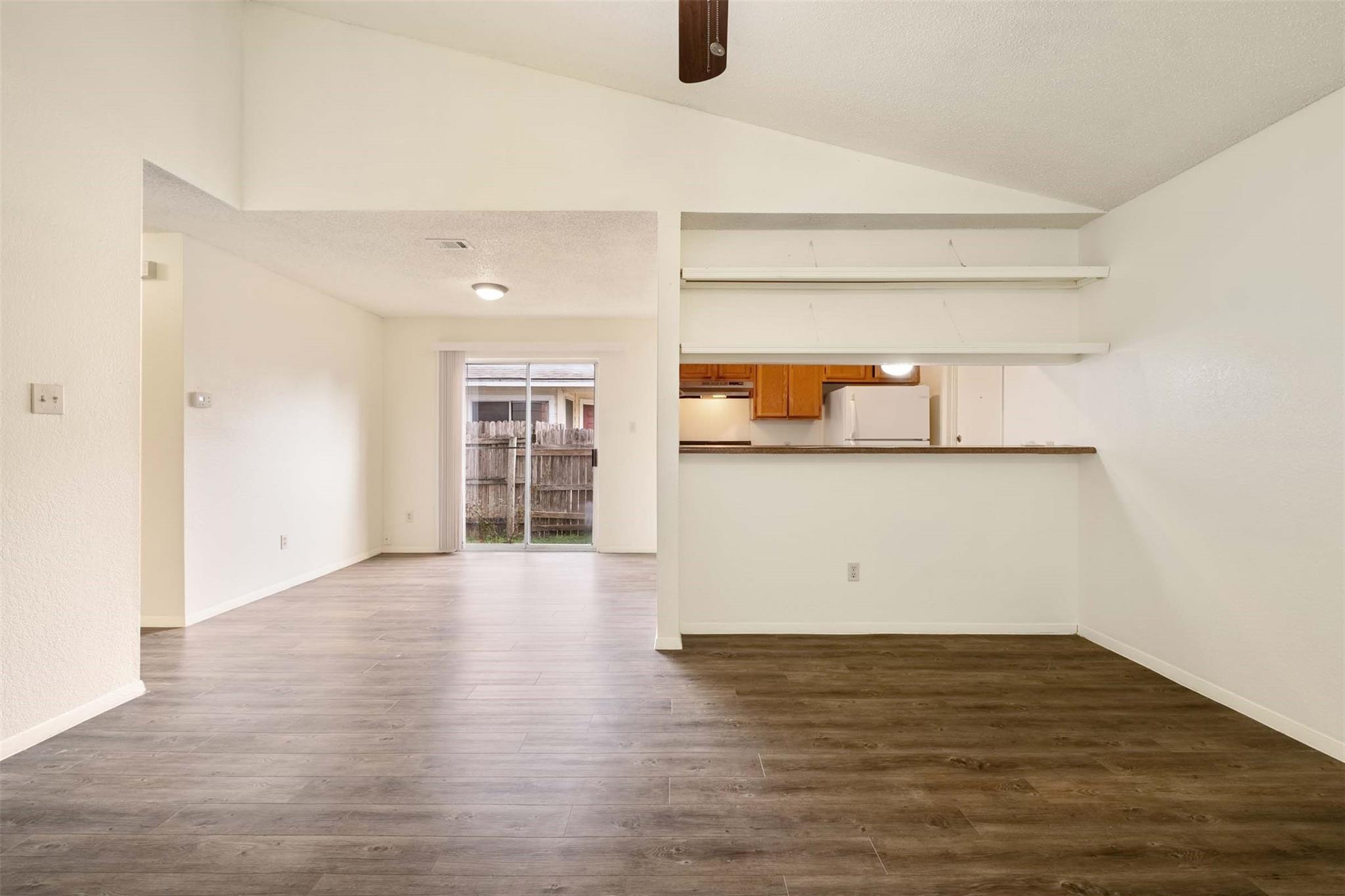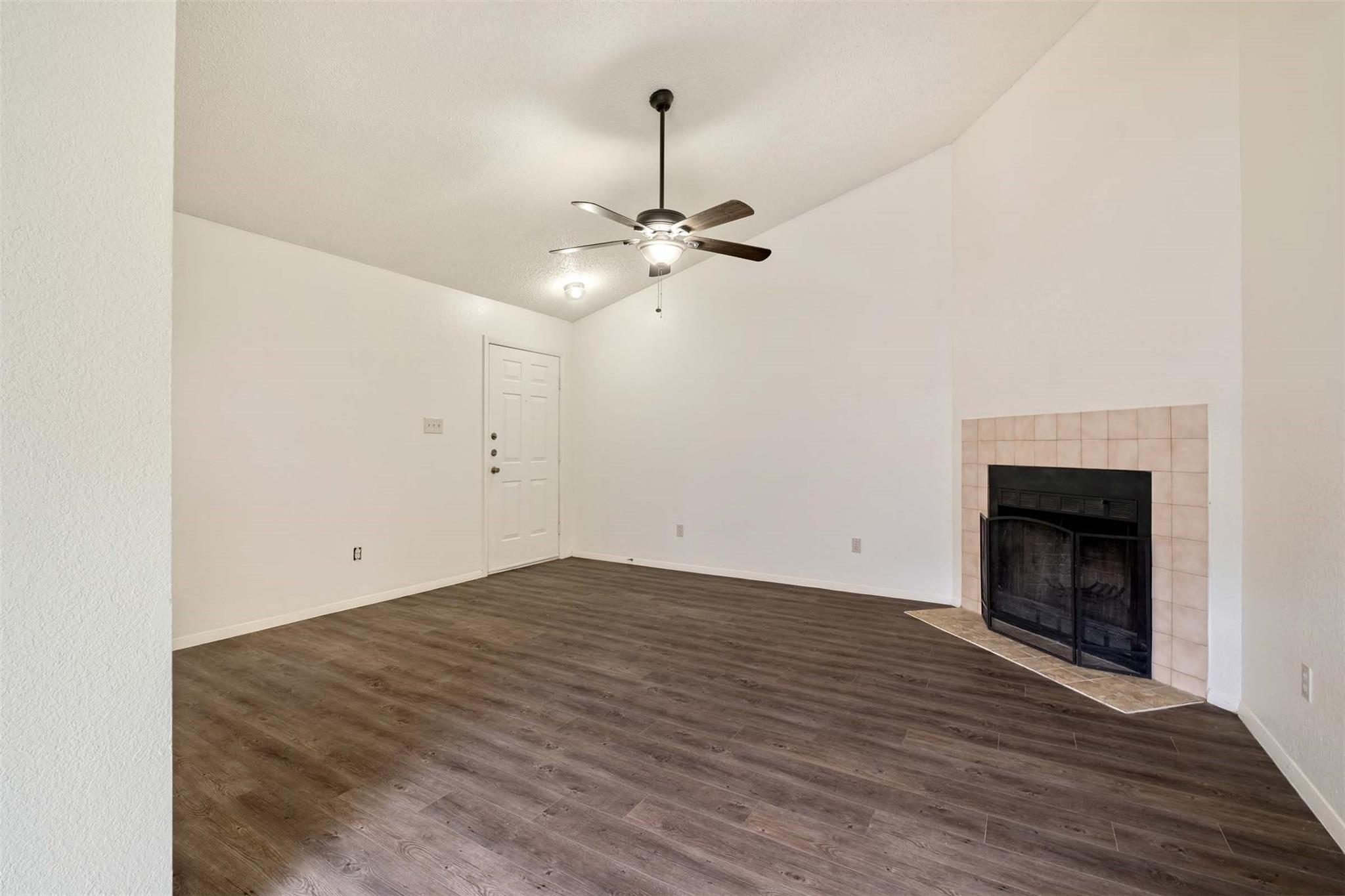 Step inside to find luxurious vinyl plank flooring seamlessly stretching throughout the entire space, offering both style and practicality. The living room boasts a dramatic vaulted ceiling that adds an air of spaciousness, while a charming fireplace invites cozy gatherings on cool evenings.