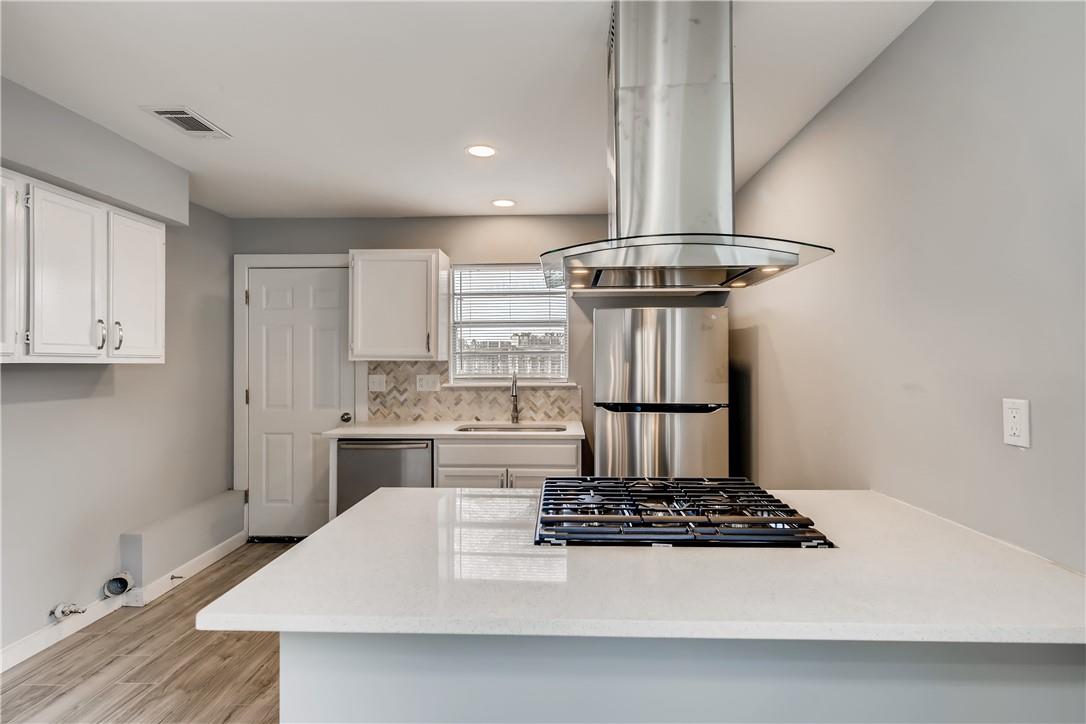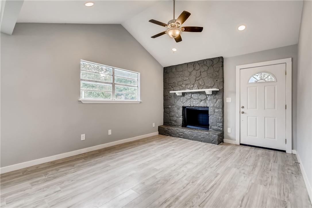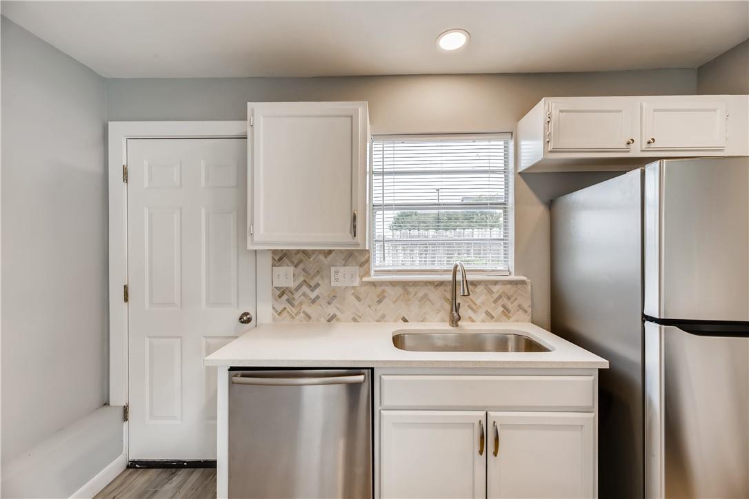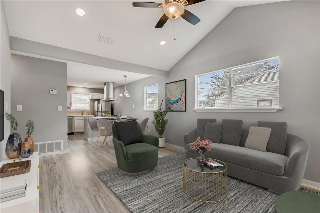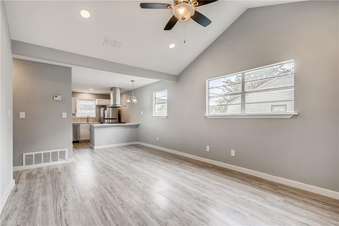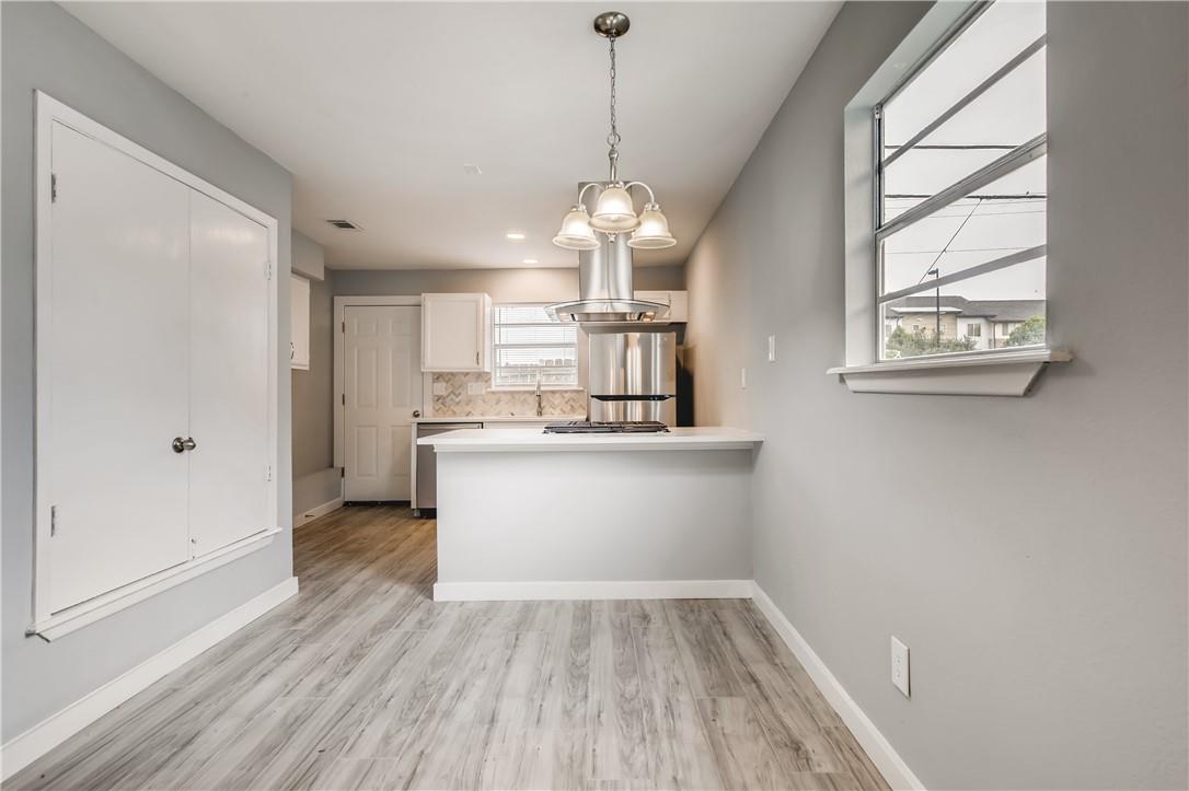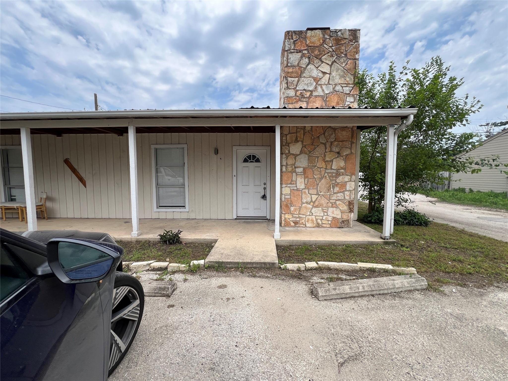 Gorgeous contemporary remodeled duplex unit. Fantastic open floorplan! Remodeled kitchen with new stainless appliances, luxury slide in gas range, designer floating vent hood, quartz counters, herringbone tile backsplash, swan neck pull out faucet. Fridge included! Breakfast bar island open to living. Grand vaulted ceilings in living with recessed lighting and ceiling fan. Designer paint colors. No carpet, all laminate and tile flooring throughout. Remodeled bath with beautiful tile-to-the-ceiling shower surround with niche, tub, raised showerhead, dual flush toilet, quartz vanity counter. All updated lighting throughout. Spacious bedrooms and walk in closet. Private fenced back yard with patio. Off street parking for 2 cars right in front. Great location, close to Texas State University, parks, HEB and more. Convenient Mill Street Market right across the street! Pet friendly. Ready for immediate move in!