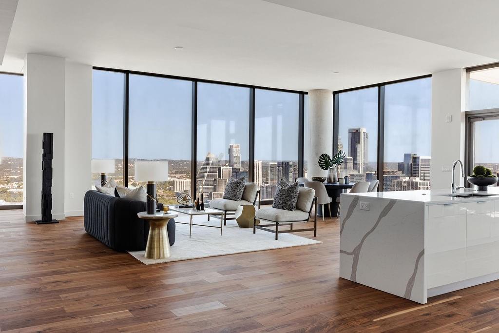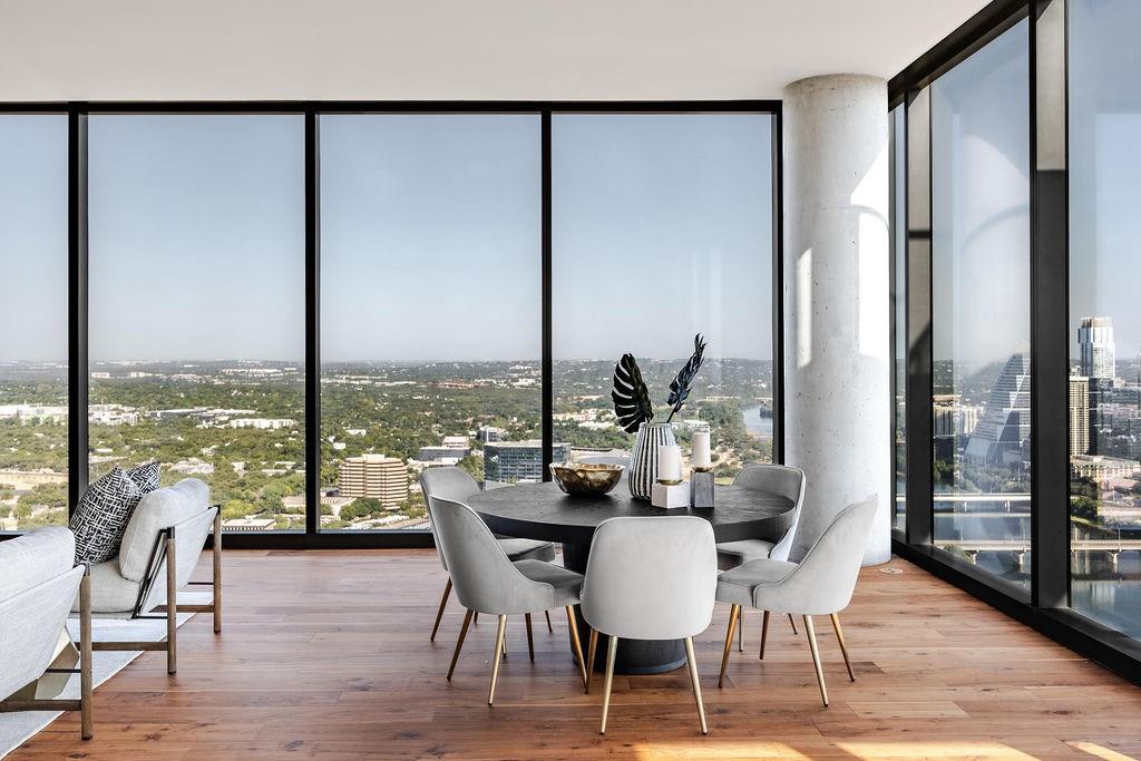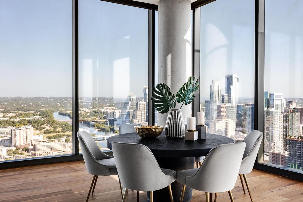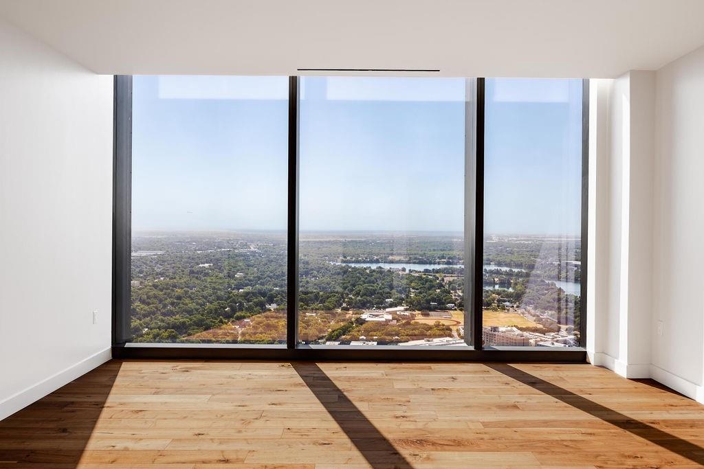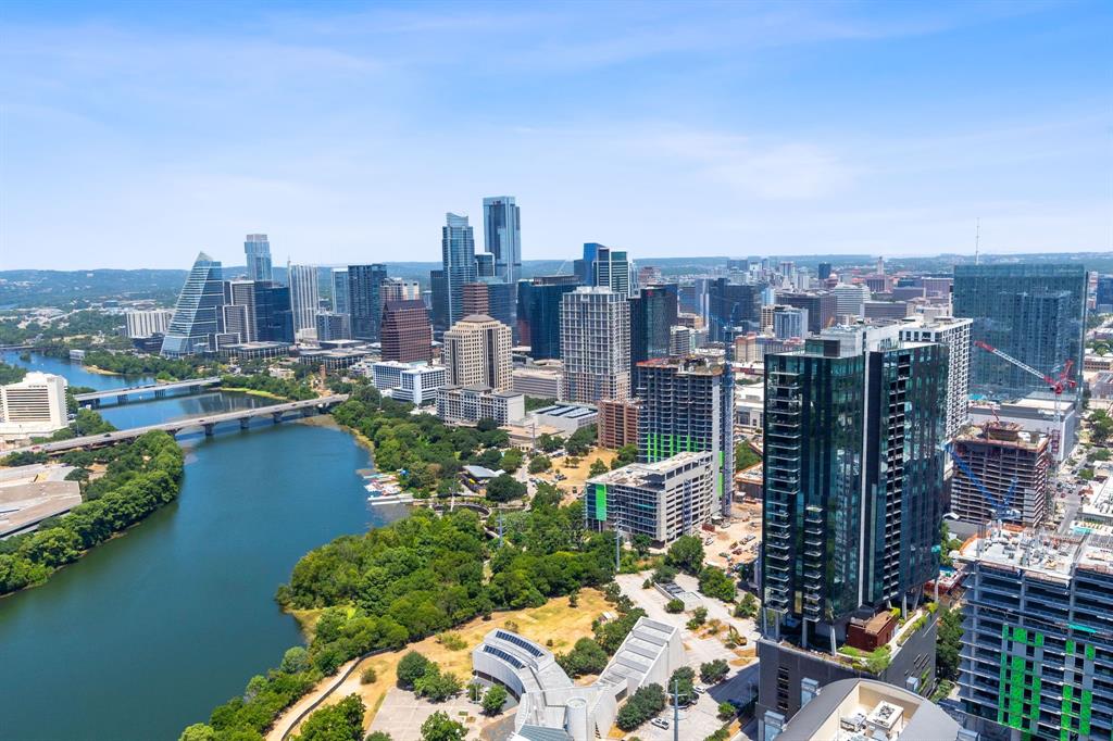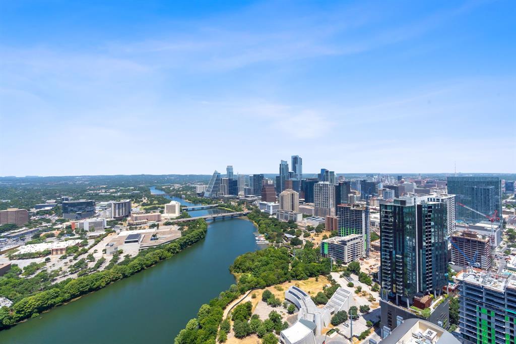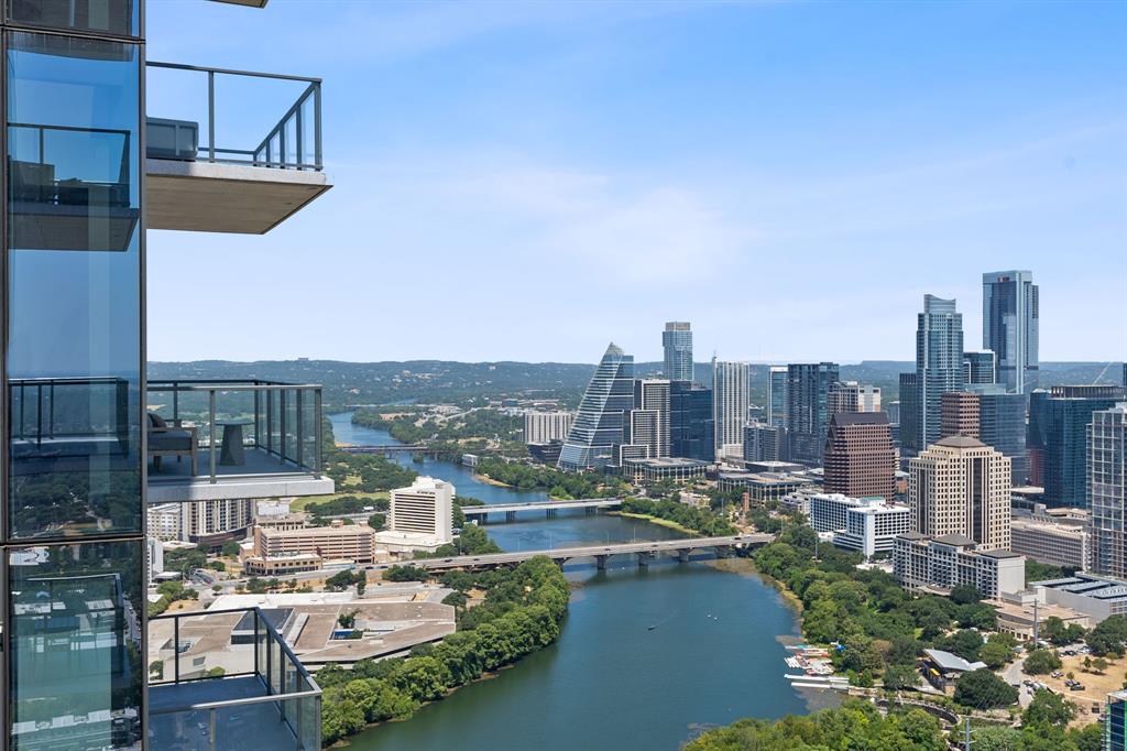 The pinnacle of urban living, epitomizing sophistication, this luxurious high-rise residence is the only combined unit to span half of the entire 45th floor creating a space of grandeur larger than any penthouse in the building with a 180-degree view of Lady Bird Lake, the hill country, Downtown, and East Austin. Completed in 2023 this project was executed with a vision of an enriched living experience, including 24-hour concierge for the highest level of service, within the glass walls of a refined, landmark build. With over 5,000 SF of living space and outdoor balconies of the finest vantage point, the custom finishes showcase high-level craftsmanship and the intentional exclusive aesthetic that inspired 44 East Avenue. Walls of glass maximize the impeccable backdrop, and wooden floors throughout intuitively elevate the open space. The vibrant kitchen features Italkraft millwork to complement the custom cabinetry, premium Thermador appliances and gas cooking top, a wine fridge, and a built-in coffee maker. Three, gracious, en-suite bedrooms showcase soaring windows and tranquil naturally lit space with excess closet and storage. The primary suite lives like a penthouse dream, with dual custom back-lit, walk-in closet, a spa-like bath with a freestanding sitting tub, and a private terrace overlooking the awe-inspiring city vistas. Exceeding suitability for all needs of the most discerning buyers, building amenities include a stunning outdoor oasis and sparkling heated pool overlooking the iconic Lady Bird Lake, a state-of-the-art fitness center, game room, family room with wet bar, additional storage, a dog lounge and dog park on-site, and 6-garage spaces to fit family or collectors needs. Unprecedented privacy, service, and lifestyle are perched atop one of the finest high-rises in Austin.