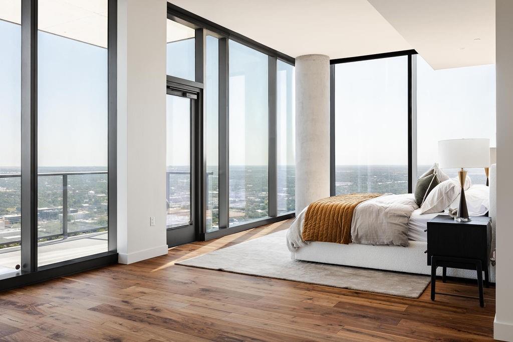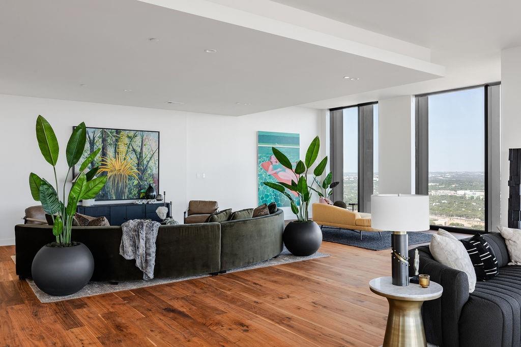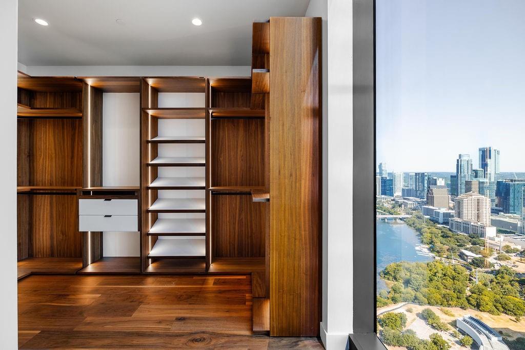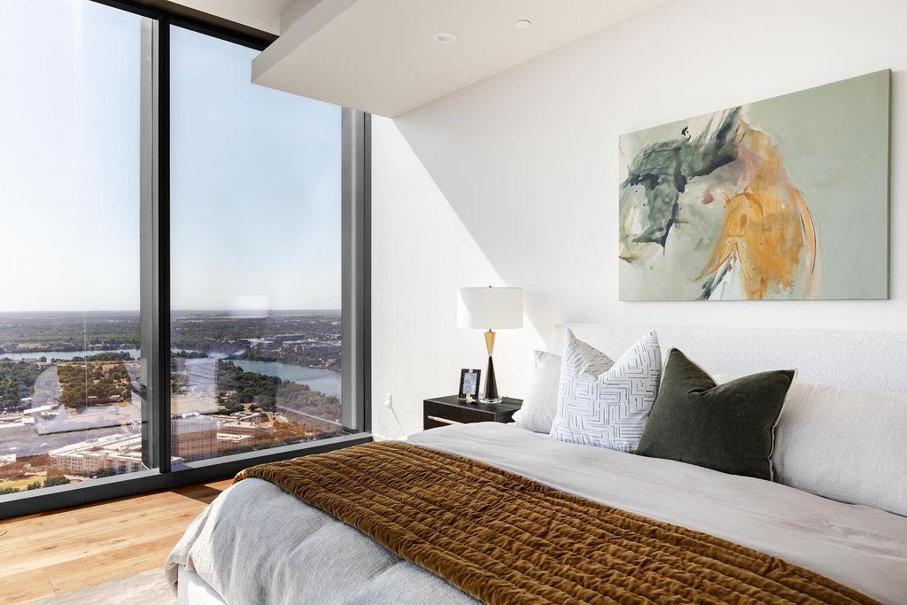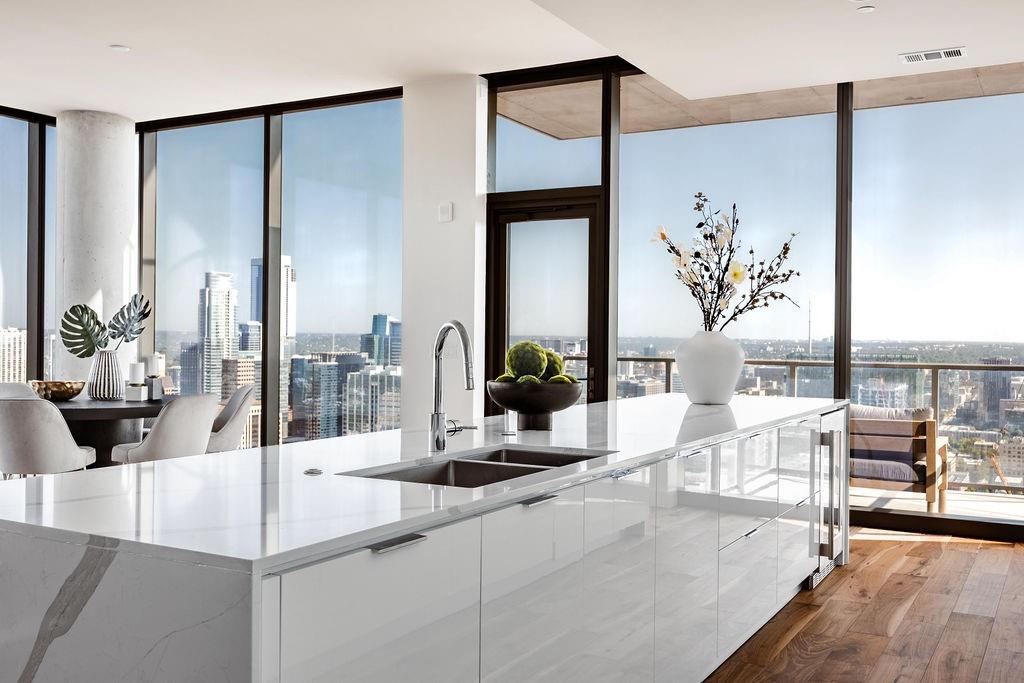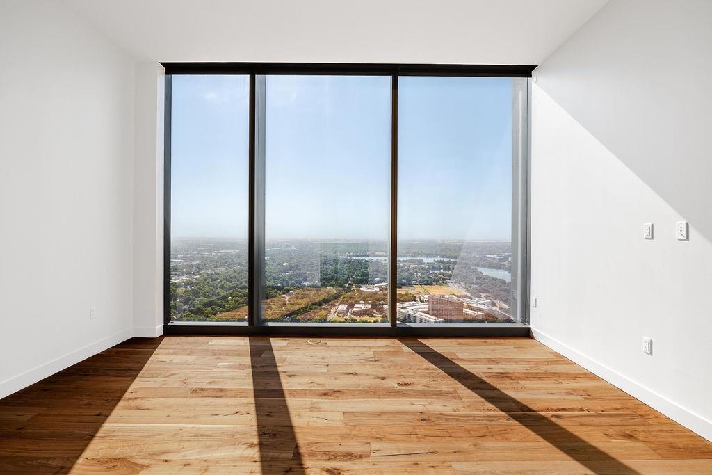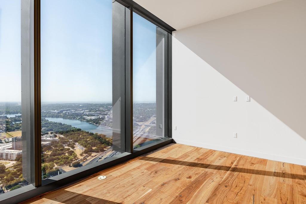 The pinnacle of urban living, epitomizing sophistication, this luxurious high-rise residence is the only combined unit to span half of the entire 45th floor creating a space of grandeur larger than any penthouse in the building with a 180-degree view of Lady Bird Lake, the hill country, Downtown, and East Austin. Completed in 2023 this project was executed with a vision of an enriched living experience, including 24-hour concierge for the highest level of service, within the glass walls of a refined, landmark build. With over 5,000 SF of living space and outdoor balconies of the finest vantage point, the custom finishes showcase high-level craftsmanship and the intentional exclusive aesthetic that inspired 44 East Avenue. Walls of glass maximize the impeccable backdrop, and wooden floors throughout intuitively elevate the open space. The vibrant kitchen features Italkraft millwork to complement the custom cabinetry, premium Thermador appliances and gas cooking top, a wine fridge, and a built-in coffee maker. Three, gracious, en-suite bedrooms showcase soaring windows and tranquil naturally lit space with excess closet and storage. The primary suite lives like a penthouse dream, with dual custom back-lit, walk-in closet, a spa-like bath with a freestanding sitting tub, and a private terrace overlooking the awe-inspiring city vistas. Exceeding suitability for all needs of the most discerning buyers, building amenities include a stunning outdoor oasis and sparkling heated pool overlooking the iconic Lady Bird Lake, a state-of-the-art fitness center, game room, family room with wet bar, additional storage, a dog lounge and dog park on-site, and 6-garage spaces to fit family or collectors needs. Unprecedented privacy, service, and lifestyle are perched atop one of the finest high-rises in Austin.