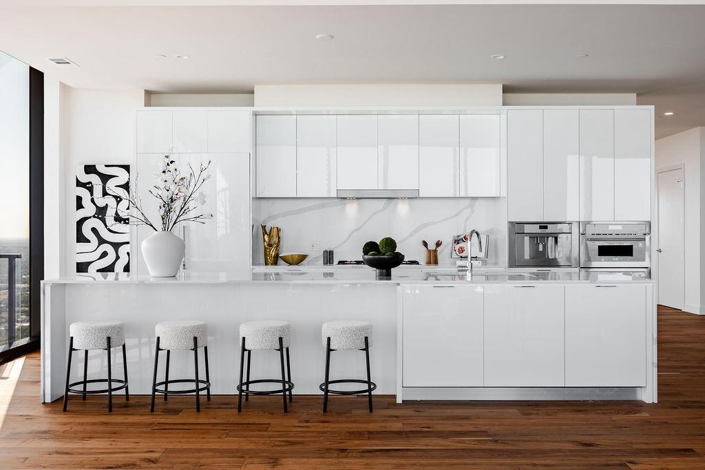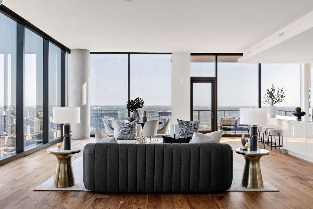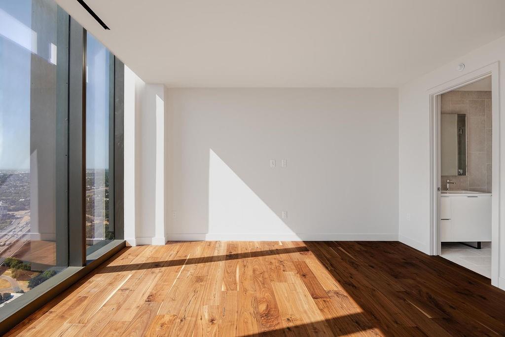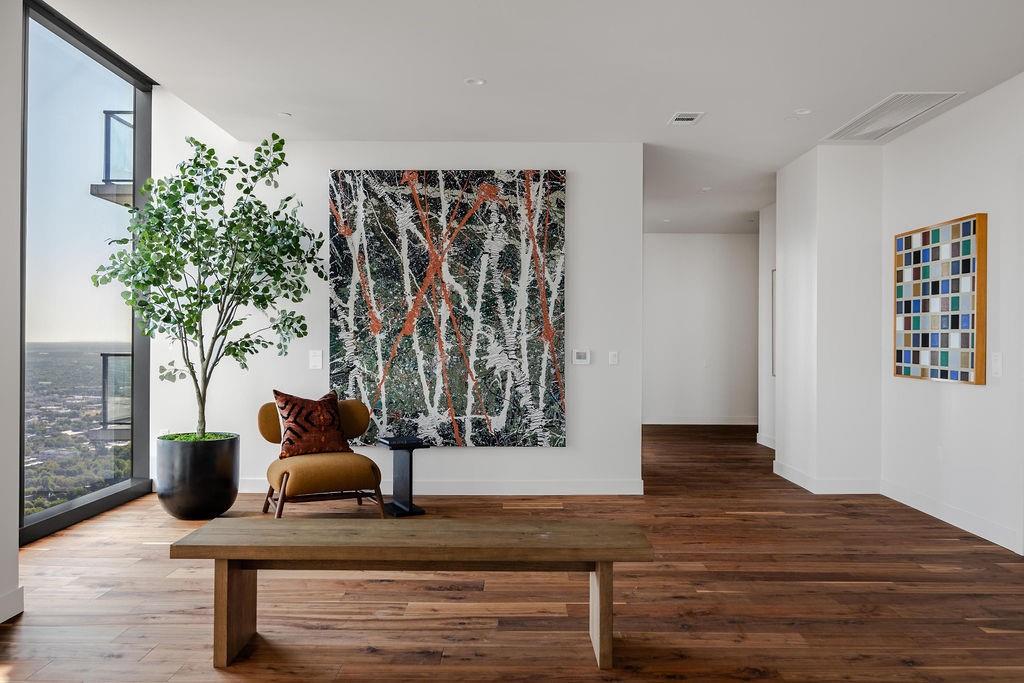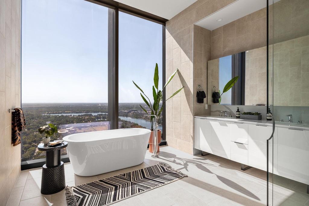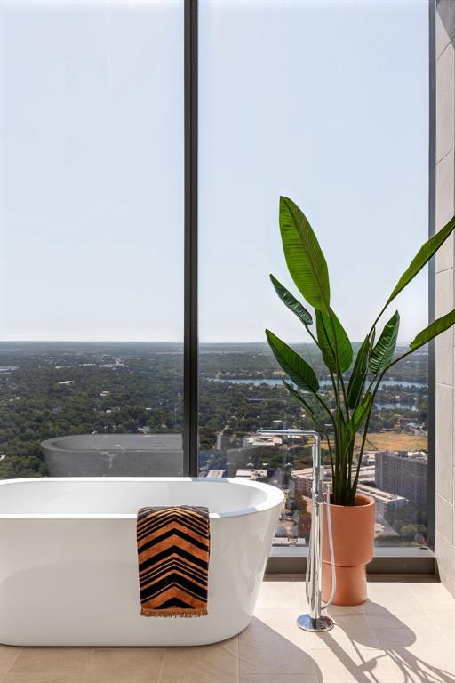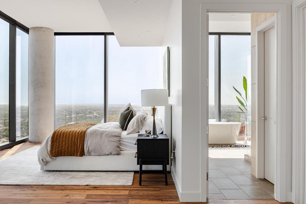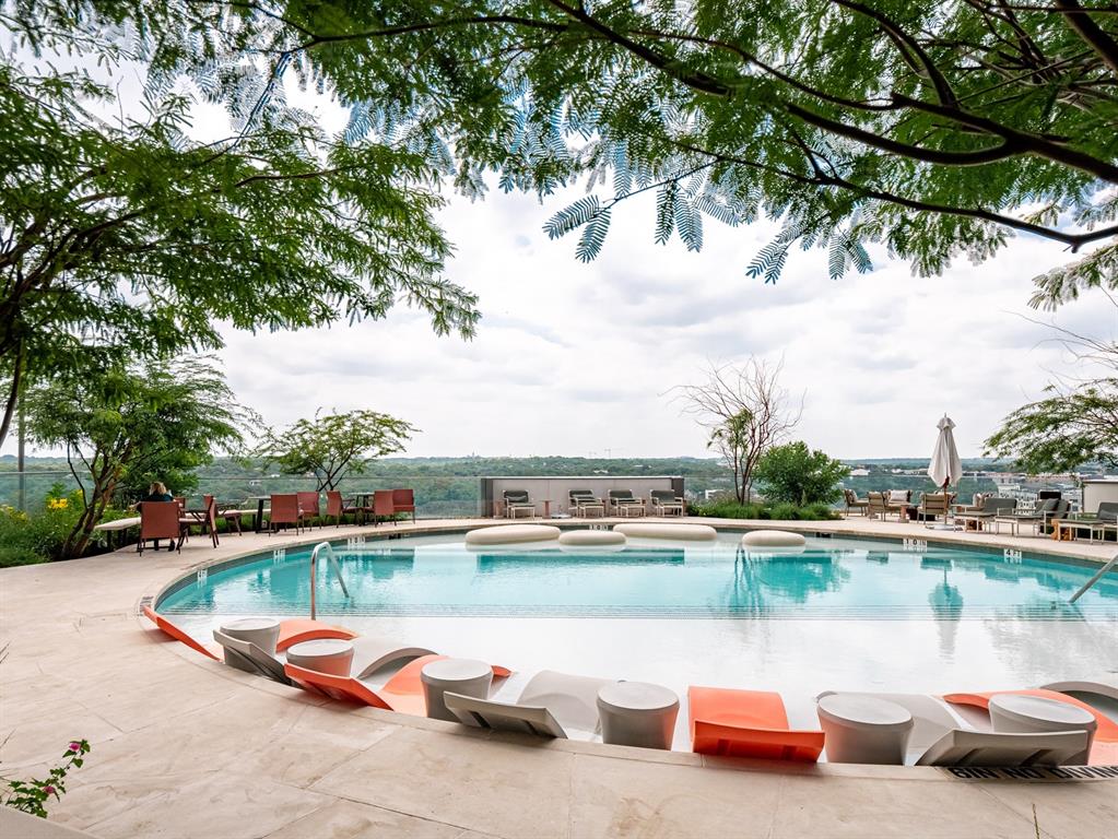 The pinnacle of urban living, epitomizing sophistication, this luxurious high-rise residence is the only combined unit to span half of the entire 45th floor creating a space of grandeur larger than any penthouse in the building with a 180-degree view of Lady Bird Lake, the hill country, Downtown, and East Austin. Completed in 2023 this project was executed with a vision of an enriched living experience, including 24-hour concierge for the highest level of service, within the glass walls of a refined, landmark build. With over 5,000 SF of living space and outdoor balconies of the finest vantage point, the custom finishes showcase high-level craftsmanship and the intentional exclusive aesthetic that inspired 44 East Avenue. Walls of glass maximize the impeccable backdrop, and wooden floors throughout intuitively elevate the open space. The vibrant kitchen features Italkraft millwork to complement the custom cabinetry, premium Thermador appliances and gas cooking top, a wine fridge, and a built-in coffee maker. Three, gracious, en-suite bedrooms showcase soaring windows and tranquil naturally lit space with excess closet and storage. The primary suite lives like a penthouse dream, with dual custom back-lit, walk-in closet, a spa-like bath with a freestanding sitting tub, and a private terrace overlooking the awe-inspiring city vistas. Exceeding suitability for all needs of the most discerning buyers, building amenities include a stunning outdoor oasis and sparkling heated pool overlooking the iconic Lady Bird Lake, a state-of-the-art fitness center, game room, family room with wet bar, additional storage, a dog lounge and dog park on-site, and 6-garage spaces to fit family or collectors needs. Unprecedented privacy, service, and lifestyle are perched atop one of the finest high-rises in Austin.