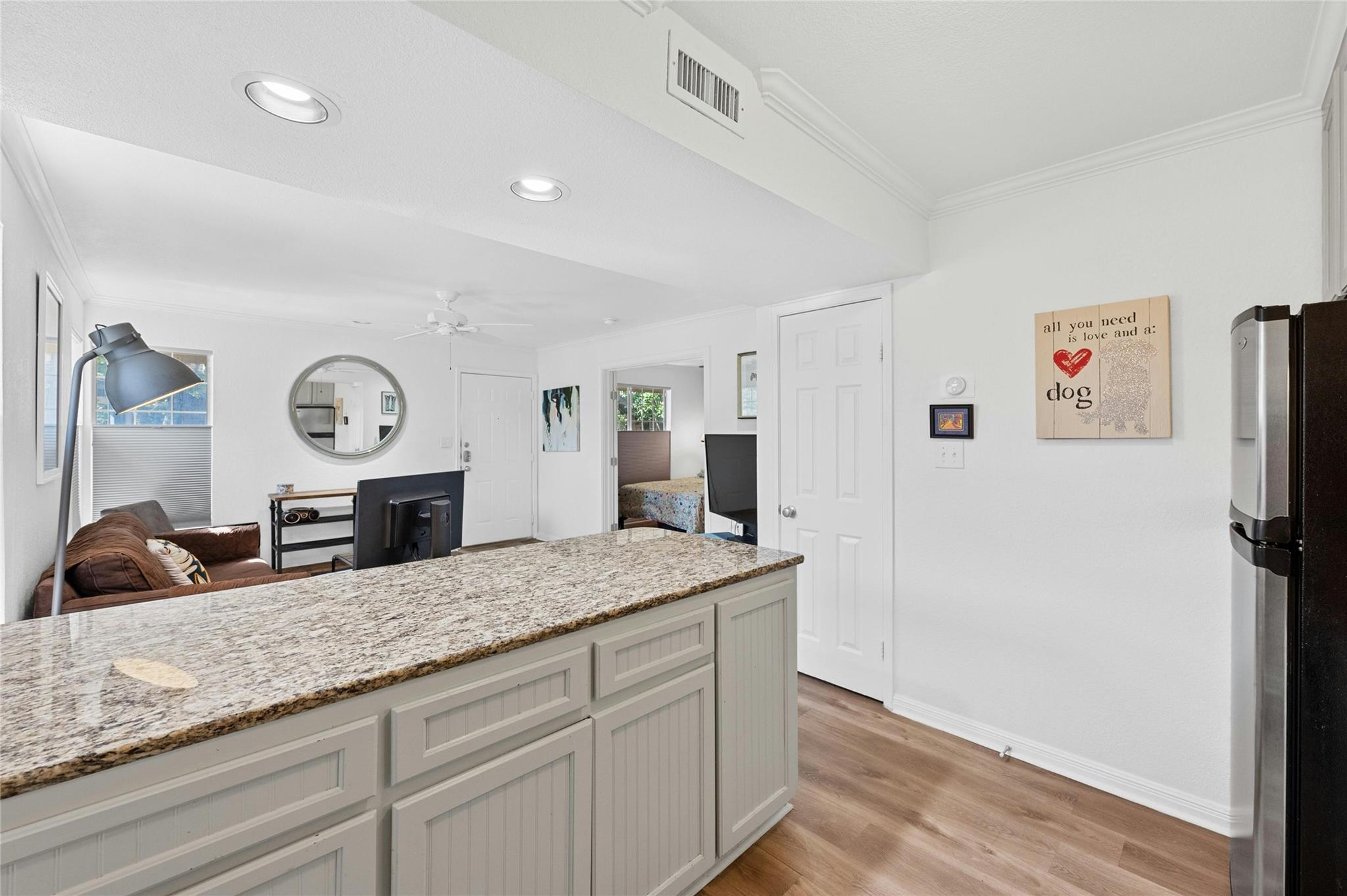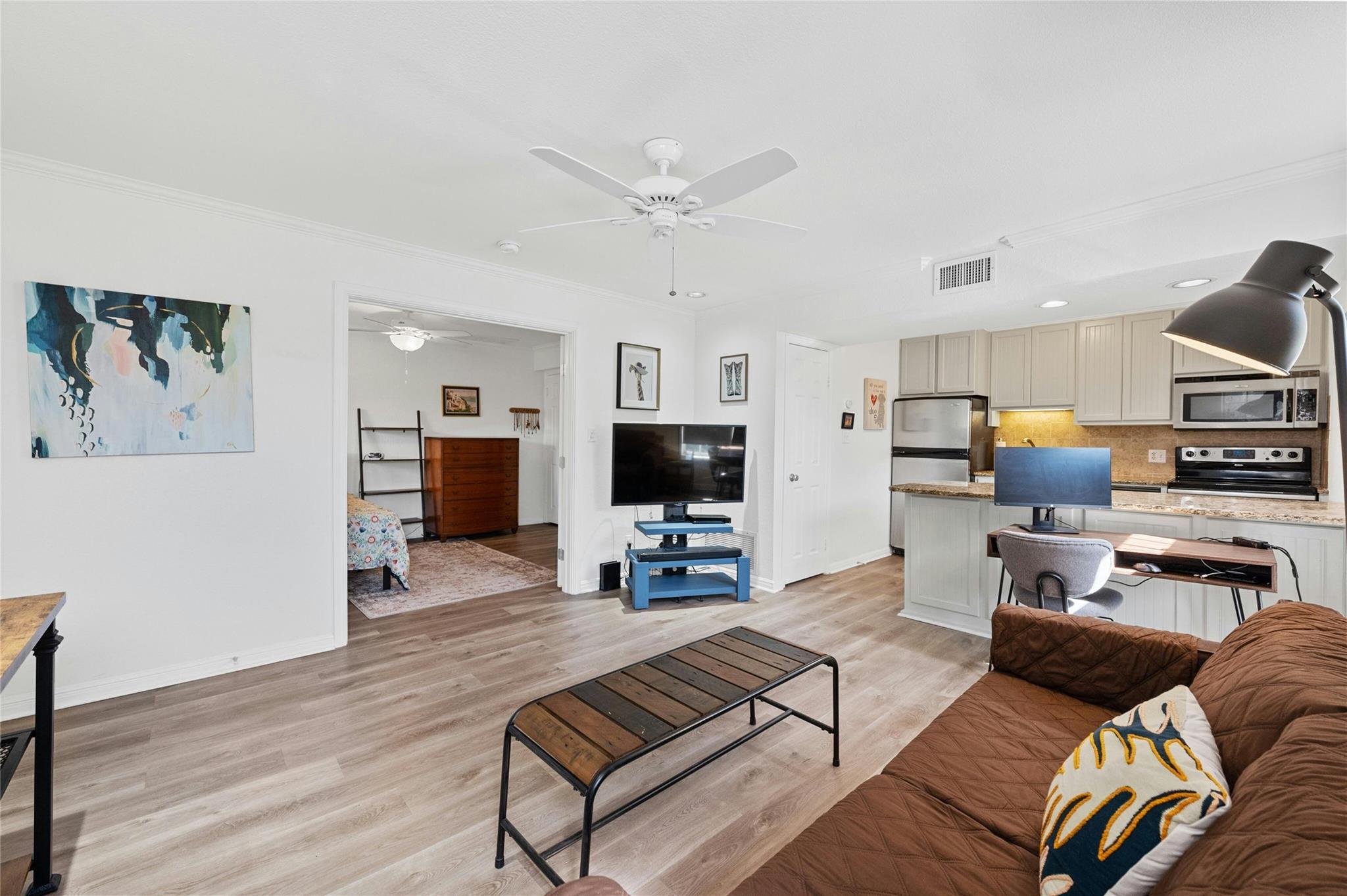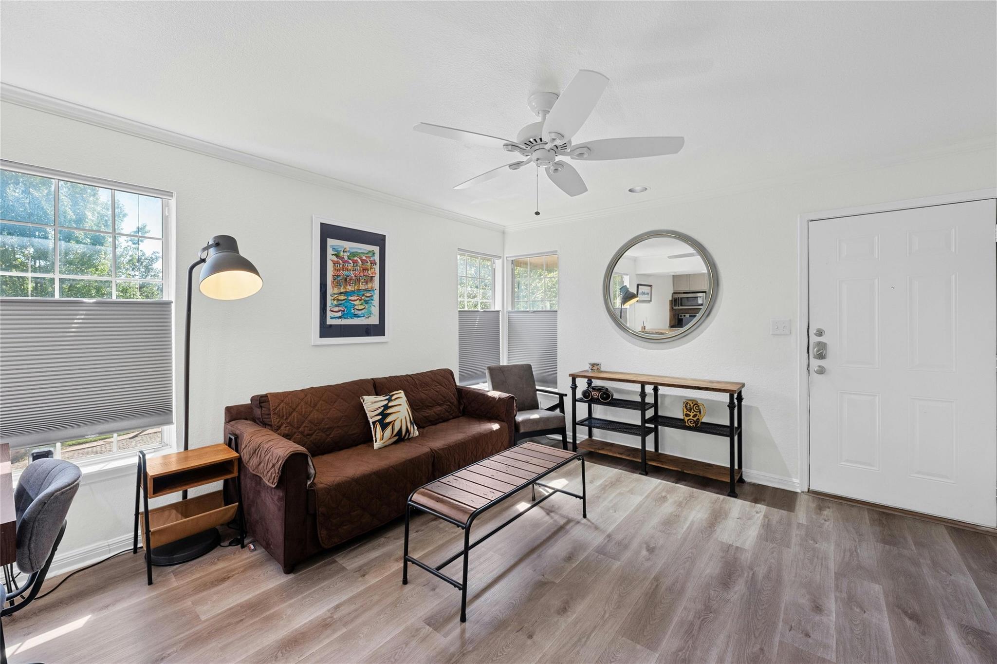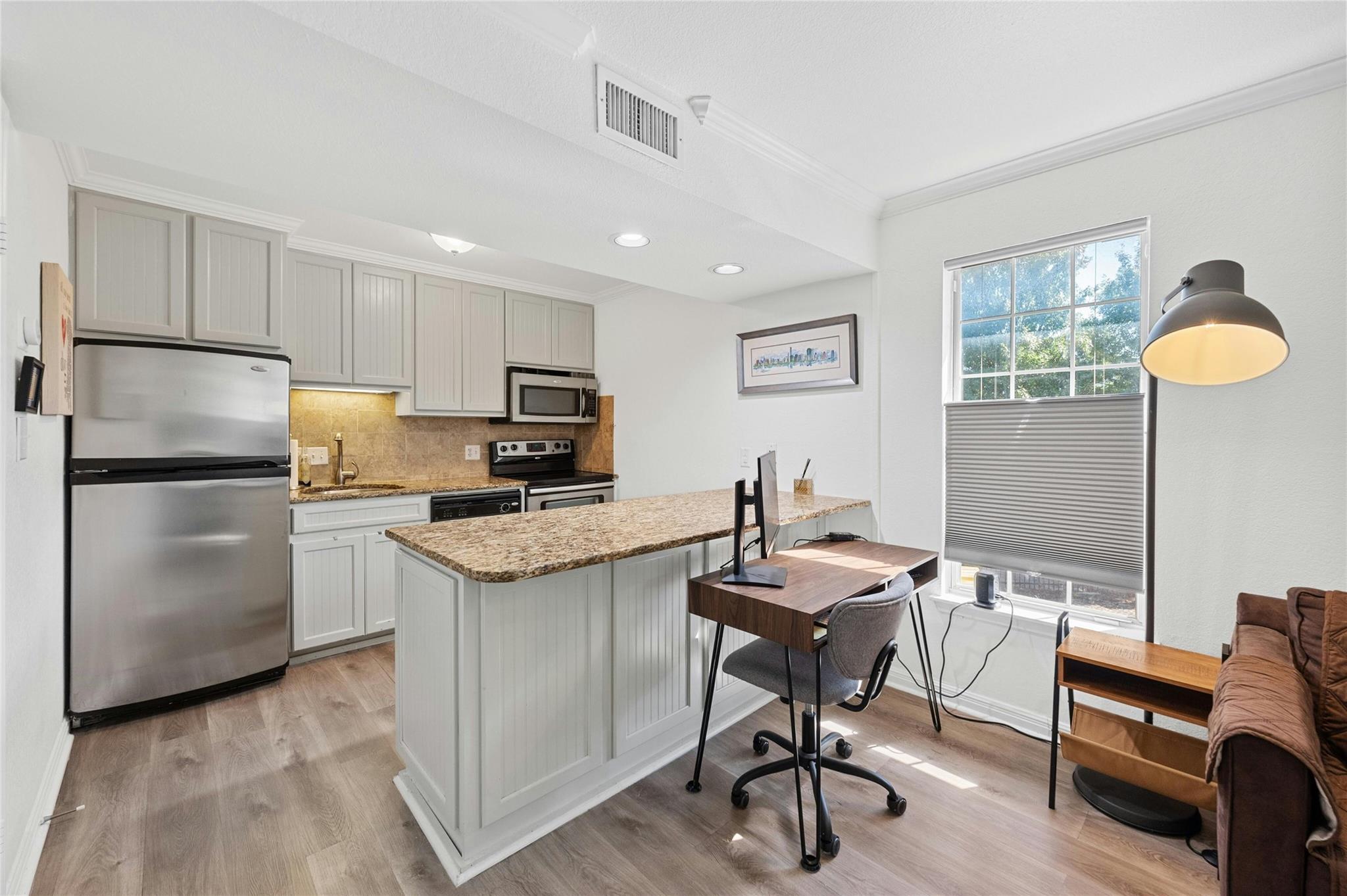 Welcome to your cozy sanctuary nestled in the heart of the city! This charming 1 bedroom, 1 bath condo offers 650 square feet of living space on the serene 2nd story corner unit. As you step inside, prepare to be greeted by an abundance of natural light that illuminates the inviting wood floors throughout the open floorplan. The galley kitchen boasts modern stainless steel appliances, complemented by elegant granite countertops, making it a chef's delight. With exclusive attic storage to 2nd story units, you'll find ample space to stow away belongings, keeping your living areas clutter-free. Step out onto the covered patio, where you can unwind and enjoy the tranquility of the surroundings, enhanced by the shade provided by a graceful tree. This outdoor oasis is perfect for morning coffee or evening relaxation. With its thoughtfully designed layout and attention to detail, this condo offers a perfect blend of comfort and style. Additional benefits include water, internet, and cable included in rent and an amenity center with fitness equipment, meeting space, communal garden and a tropical pool area. Walkable to nearby restaurants, shops, and grocery stores. Don't miss out on the opportunity to make this your new home sweet home!