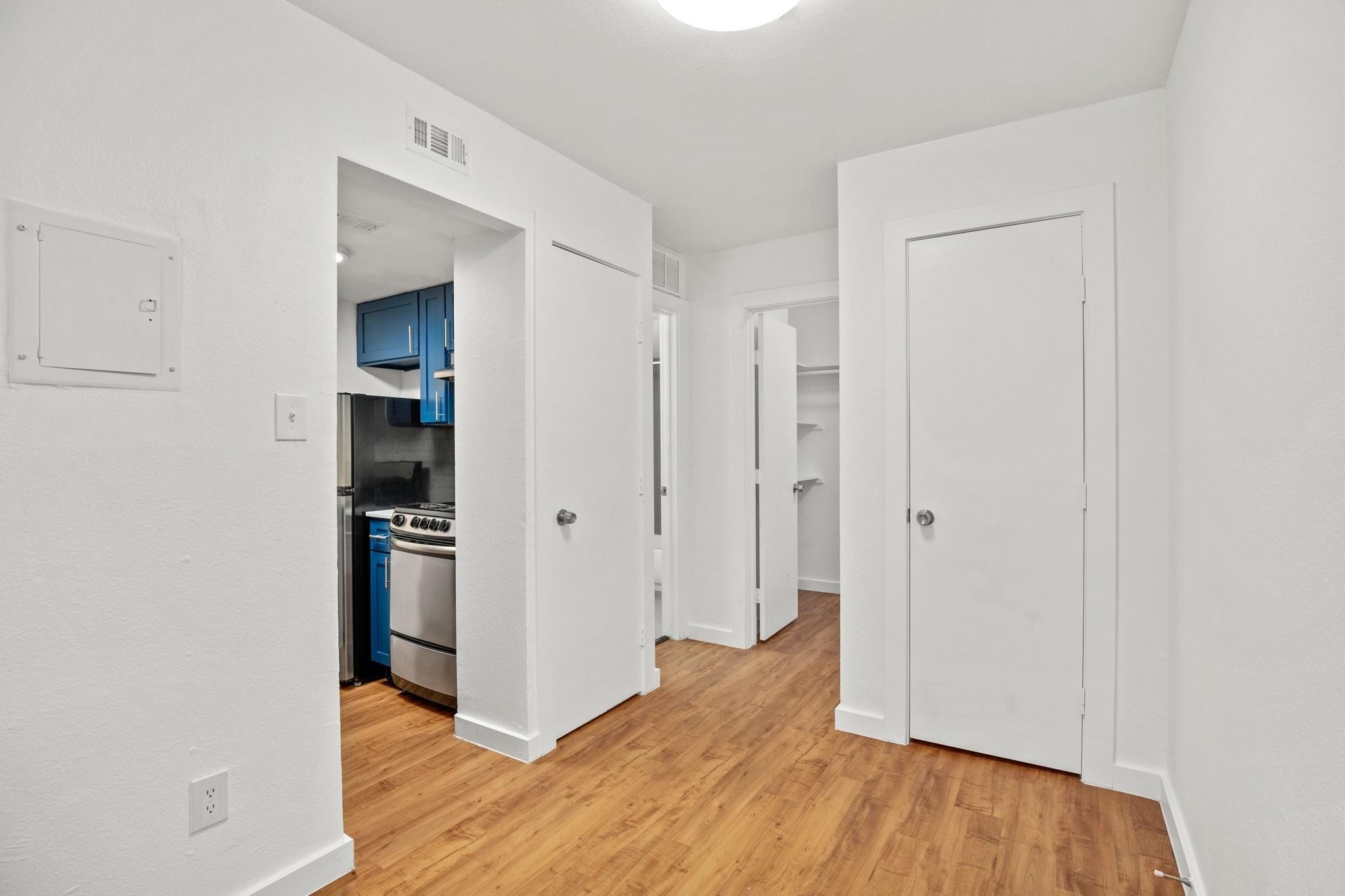 Close to bus line, walk to grocery and restaurants. Wood floors, stainless appliances, large walk in closet, laundry in back of property. Parking on site. Google Fiber available. One pet limit--max weight 35lbs. $500 refundable pet deposit $25 monthly pet rent per pet. Admin. Fee due upon lease signing: $295