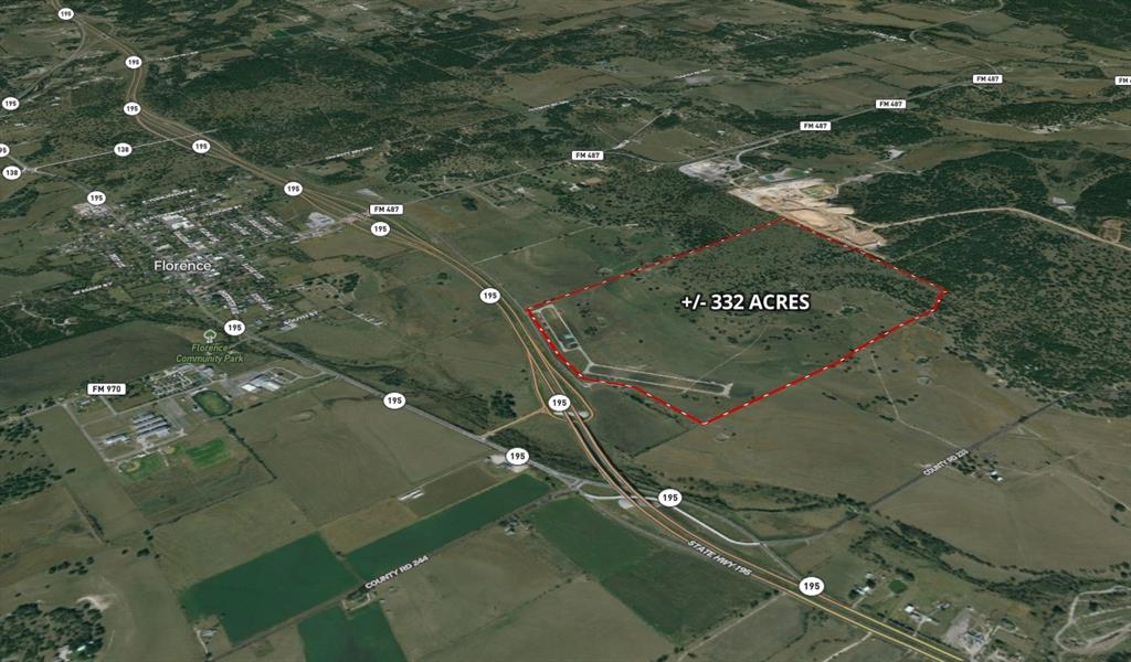 NEW to market 332-acre ranch with gentle, rolling topography, beautiful live oaks, multiple stock tanks and well-maintained open spaces. 1,700+ feet of frontage on Hwy 195 feeder road. Outside the city limits of Florence, TX and inside Williamson County.