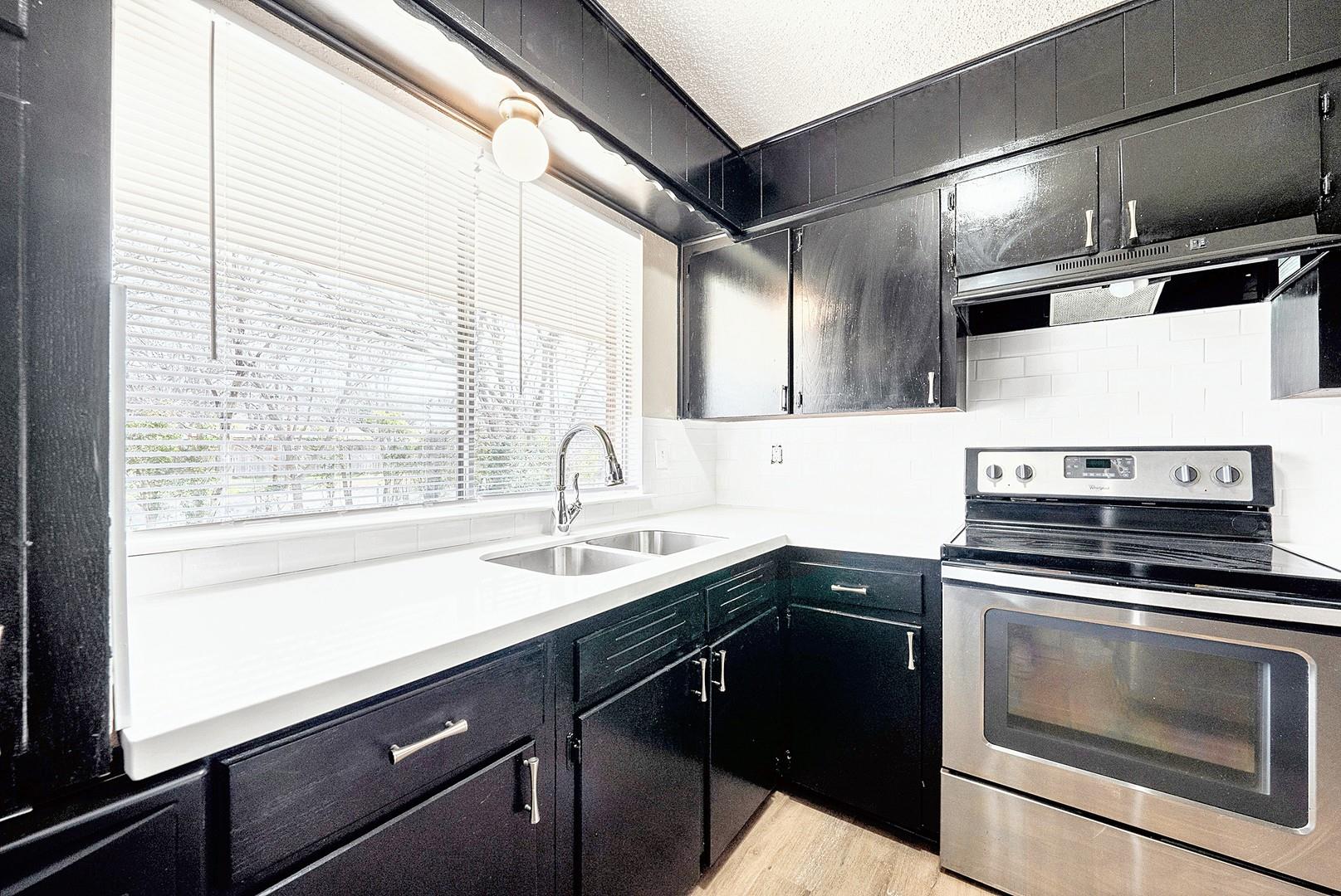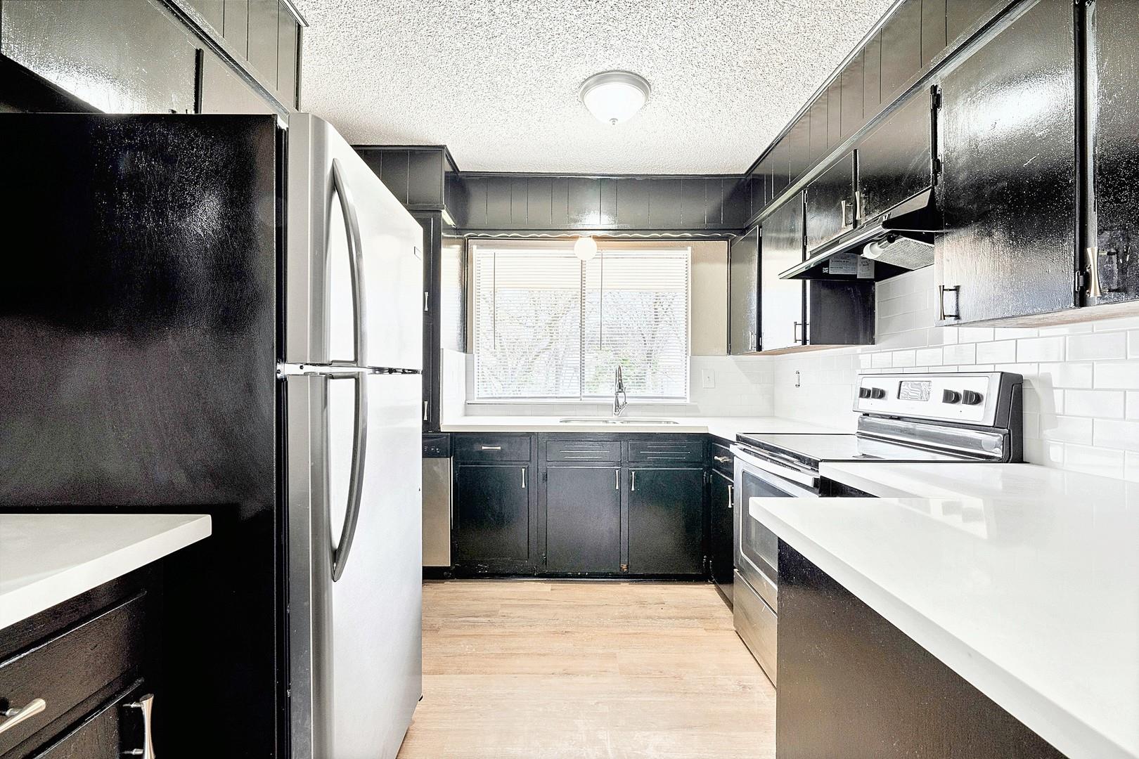 The well-equipped kitchen boasts stainless steel appliances and black wood cabinets, creating a sleek and functional culinary hub.
