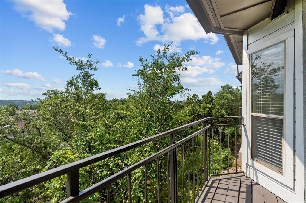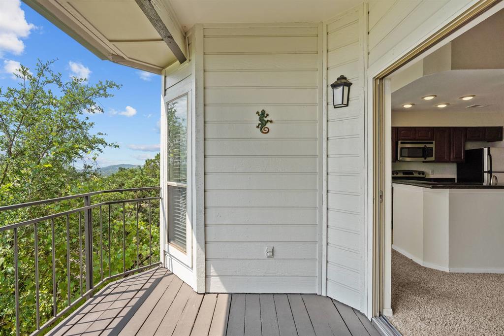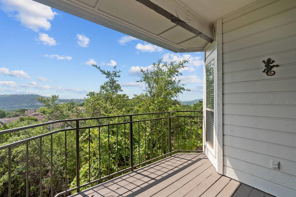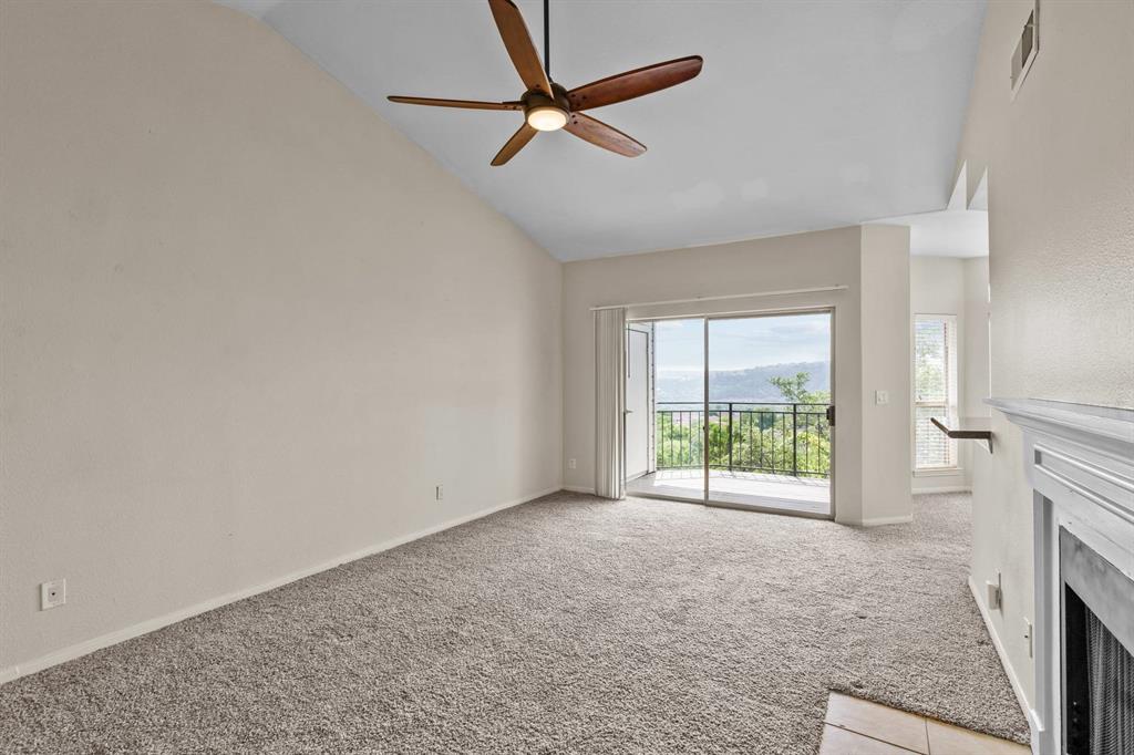 Panoramic Views from your private balcony! This 1-bedroom / 1-bathroom condo is on the top floor so no one is overhead. Enjoy your morning coffee or cocktail after a long day while overlooking the breathtaking views of the Hill Country from your covered balcony. Living room showcases a vaulted ceiling, wood burning fireplace, and ceiling fans. Condo also features a dining area, bar seating, and gourmet kitchen with granite countertop and Stainless Steel appliances. Bedroom features a walk-in closet and ceiling fan. Located just north of the Pennybacker Bridge, the Monte Vista Community is ideally situated right off Capital of Texas Hwy / 360, the hike and bike trails, Lake Austin, Davenport Village, Bull Creek, Arboretum, Domain, and so much more.... This community offers incredible amenities, including a resort-style pool, hot tub, outdoor kitchen/BBQ, fitness center, and clubhouse. Includes 1 designated parking space (Parking Spot is V4), refrigerator, and washer & dryer. HOA covers water, sewer, and trash.