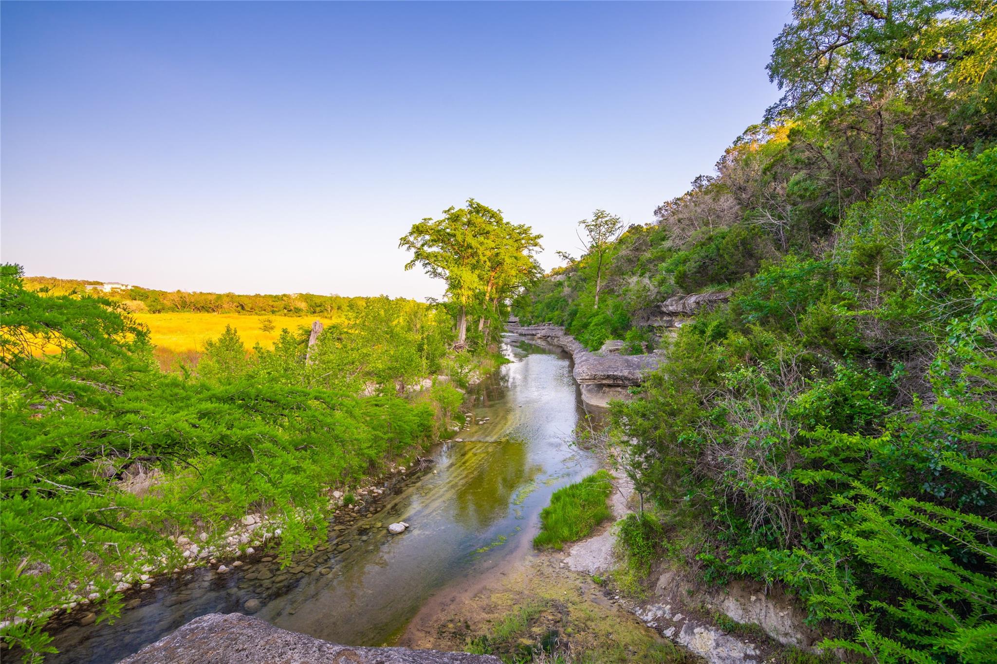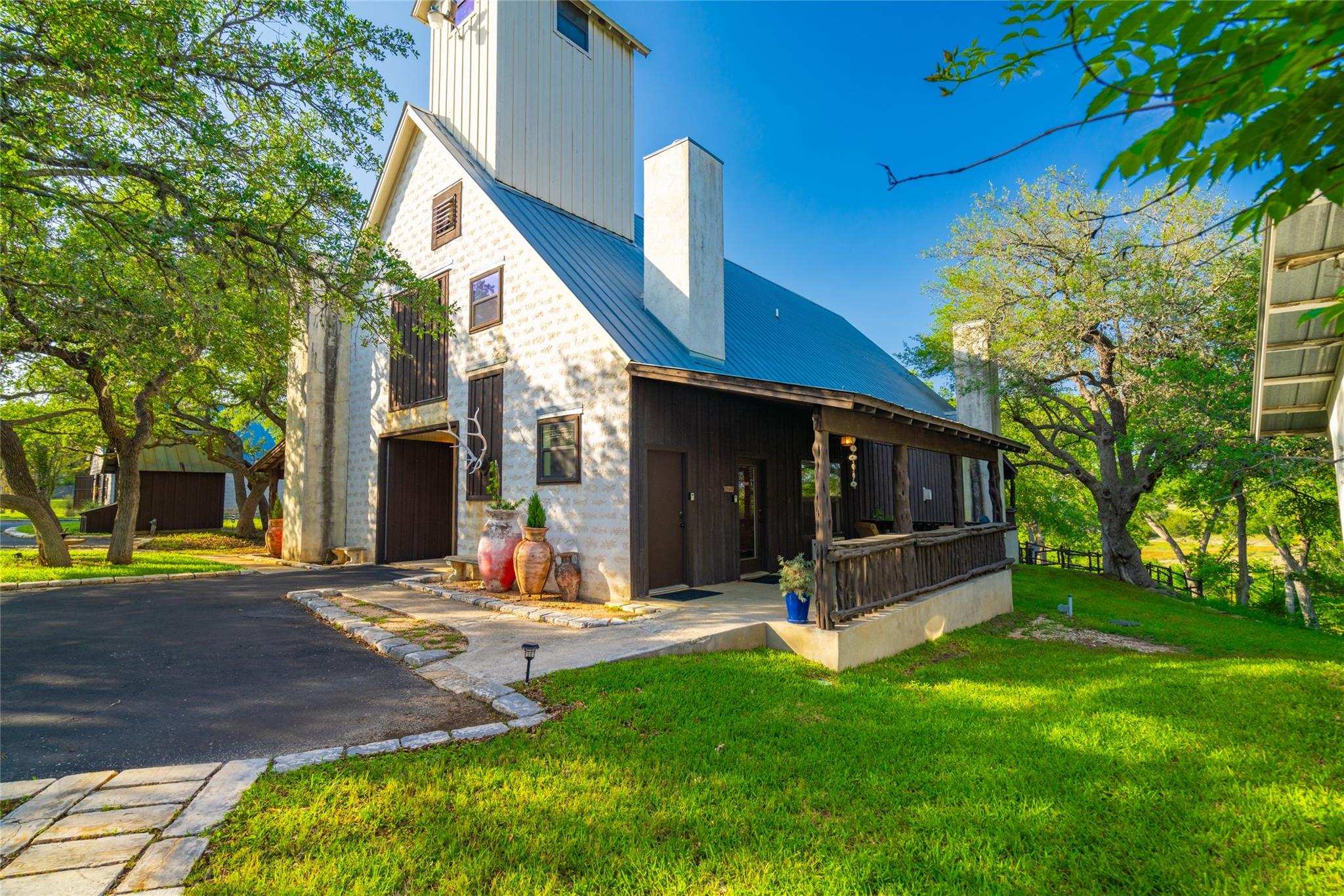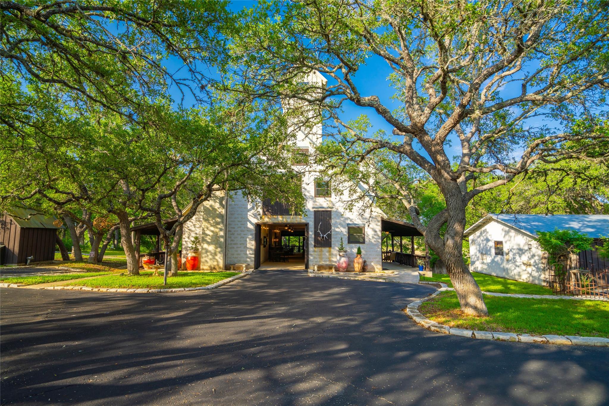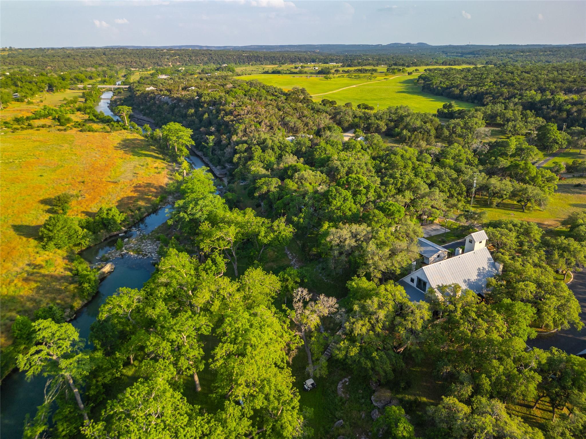 Located just 8 miles from the Wimberley Square, this 23.5+/- acre property is truly unparalleled. Featuring 740.5+/- ft of premium spring-fed Blanco River frontage with gentle rapids, a partial dam, deep swimming areas, limestone coves, karst formations, and fern-lined waterfalls. The secluded main home has been remodeled with contemporary finishes and features an infinity pool, covered pavilion with an outdoor kitchen, and a putting green. The guest lodge, previously used for short-term rentals, features 4 separate suites each with its own entrance, fireplace, kitchenette, en-suite bath, and covered porch. Built to resemble a barn, the suites are connected with a gathering space with barn doors that can be opened to let the air through. The 2nd floor of the lodge is a large game-room equipped with a bar, kitchenette and a half-bath. Additional amenities include a detached 950 sqft studio, a detached 2-car garage and workshop, a 3-stall barn, perimeter high-fencing and cross-fencing, electric gated access and underground utilities.