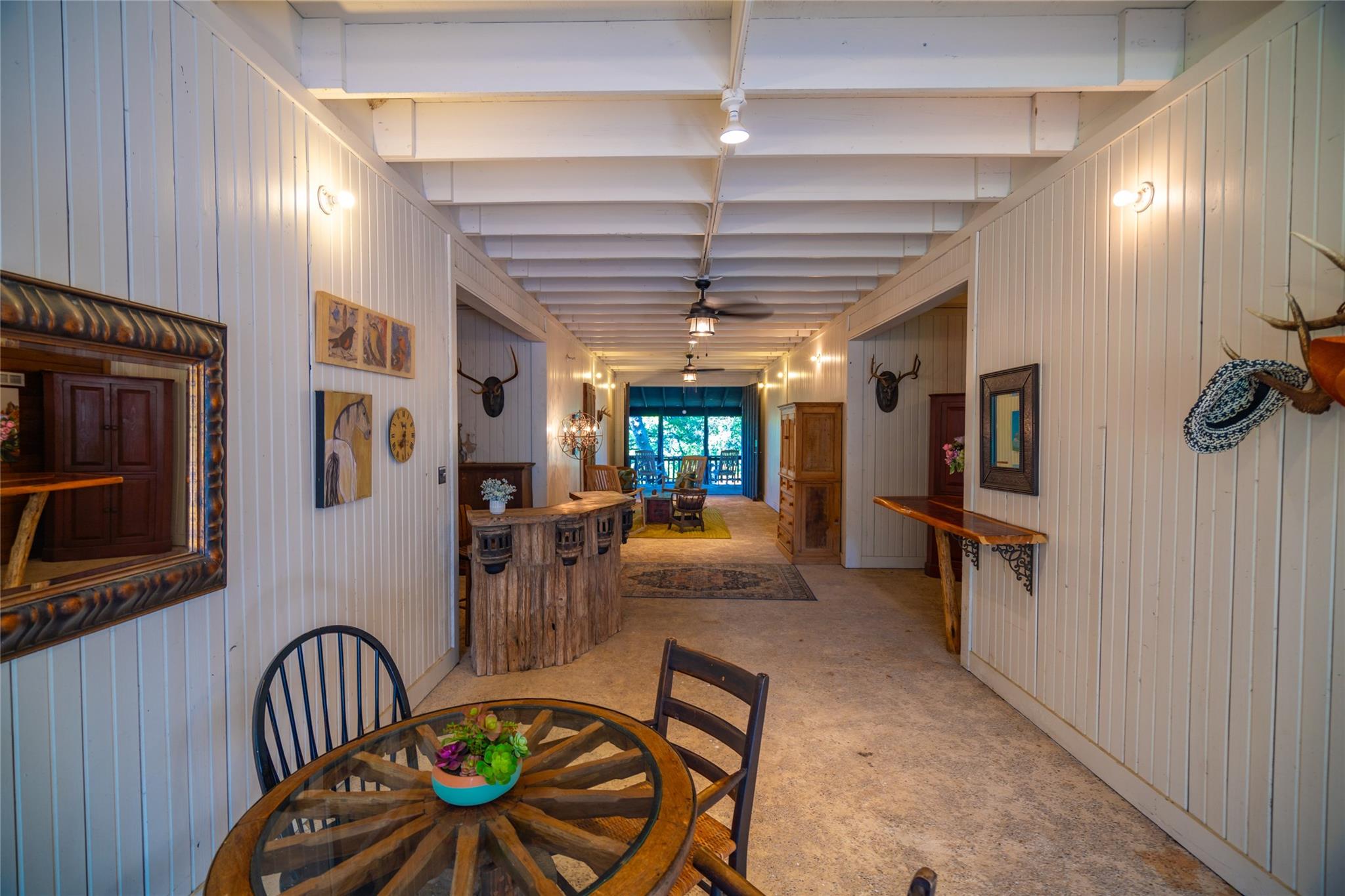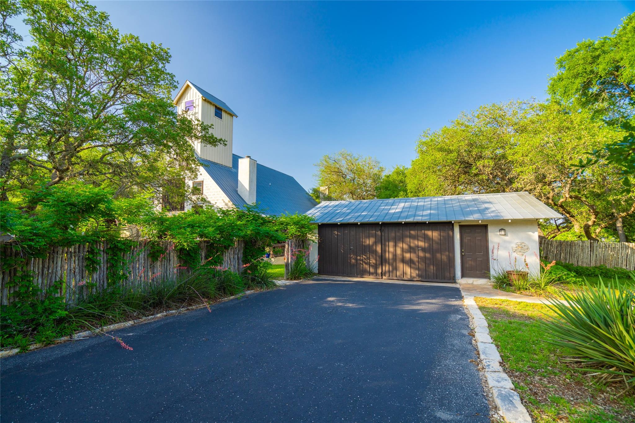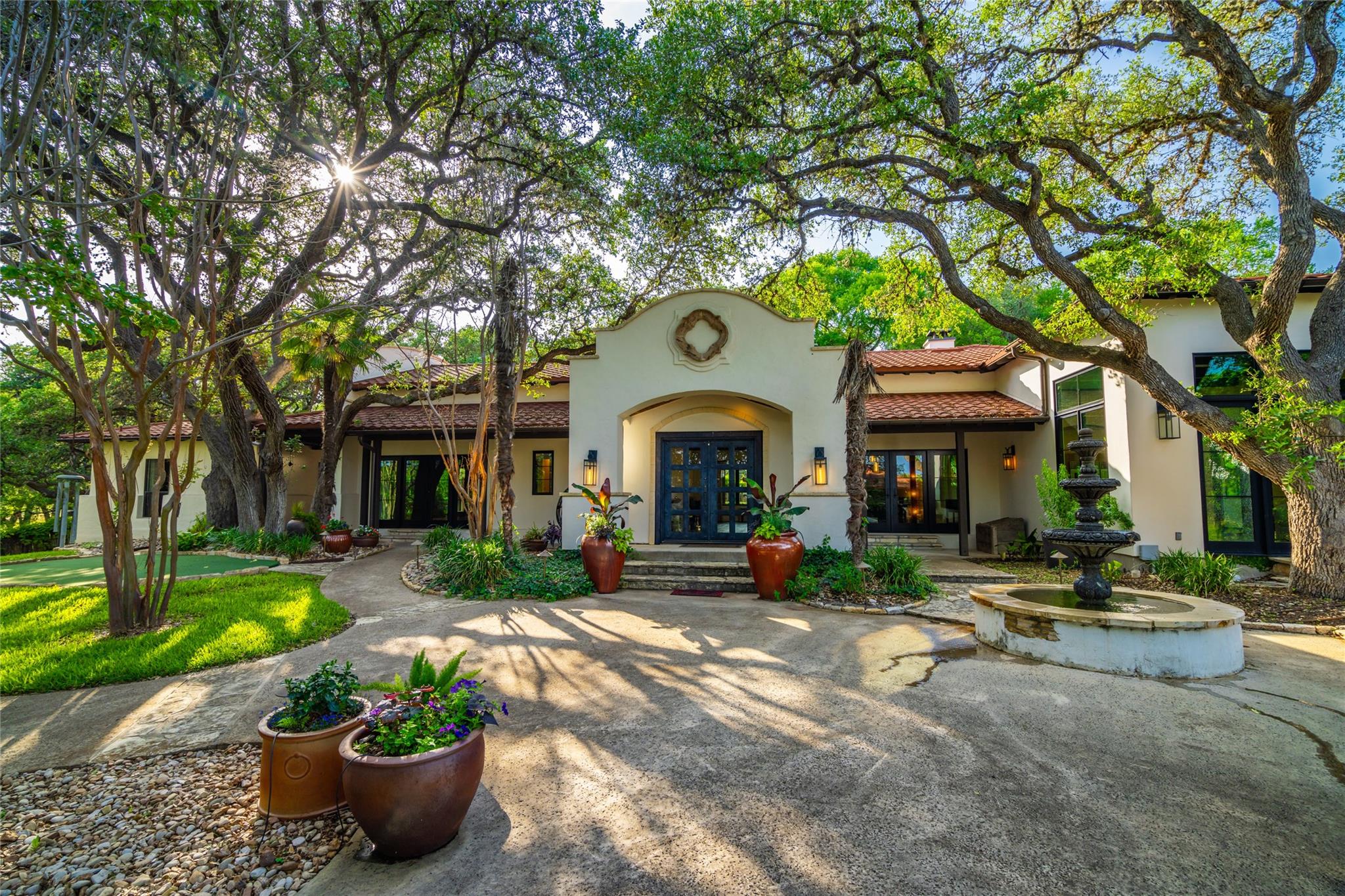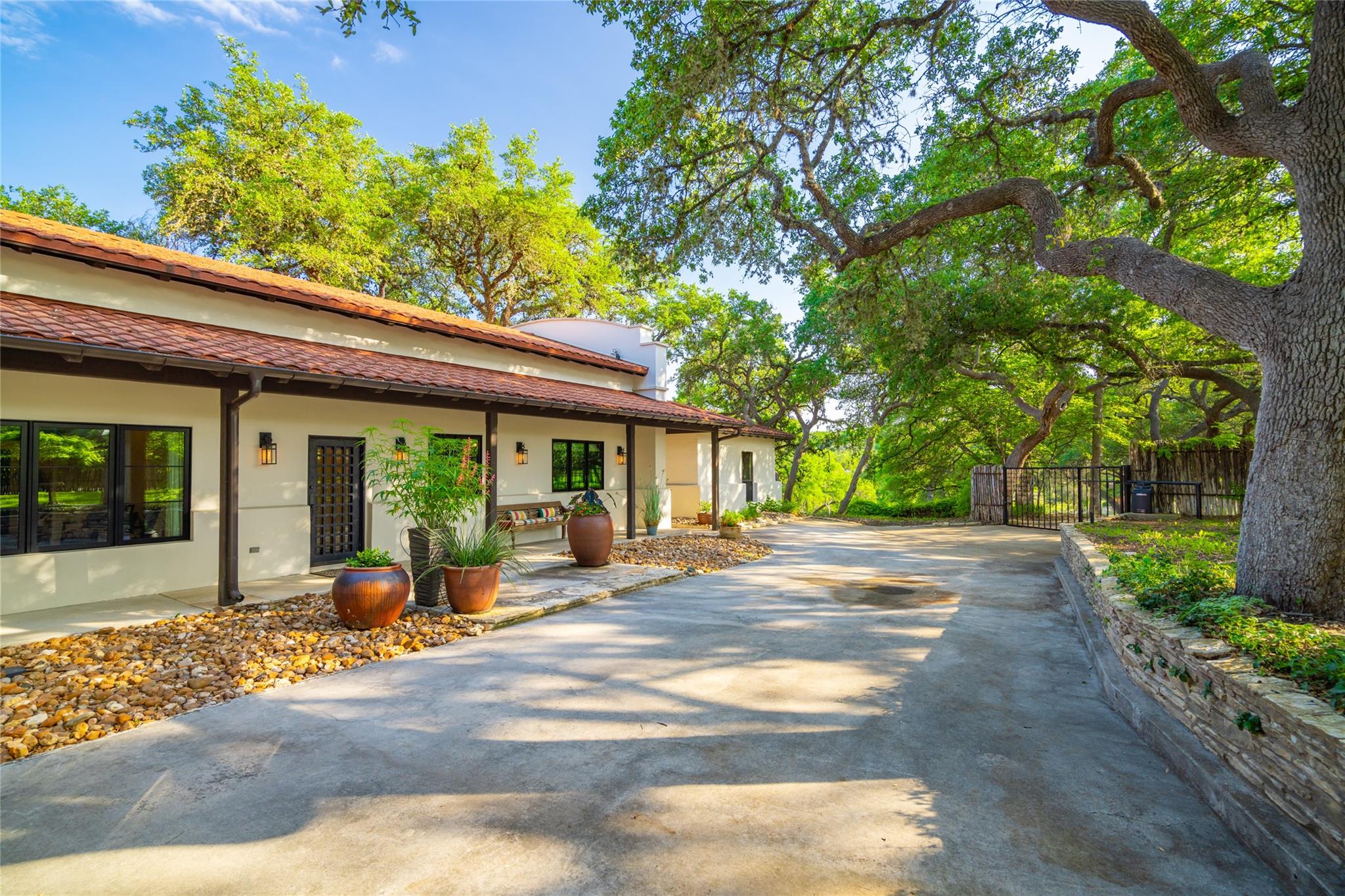 Located just 8 miles from the Wimberley Square, this 23.5+/- acre property is truly unparalleled. Featuring 740.5+/- ft of premium spring-fed Blanco River frontage with gentle rapids, a partial dam, deep swimming areas, limestone coves, karst formations, and fern-lined waterfalls. The secluded main home has been remodeled with contemporary finishes and features an infinity pool, covered pavilion with an outdoor kitchen, and a putting green. The guest lodge, previously used for short-term rentals, features 4 separate suites each with its own entrance, fireplace, kitchenette, en-suite bath, and covered porch. Built to resemble a barn, the suites are connected with a gathering space with barn doors that can be opened to let the air through. The 2nd floor of the lodge is a large game-room equipped with a bar, kitchenette and a half-bath. Additional amenities include a detached 950 sqft studio, a detached 2-car garage and workshop, a 3-stall barn, perimeter high-fencing and cross-fencing, electric gated access and underground utilities.