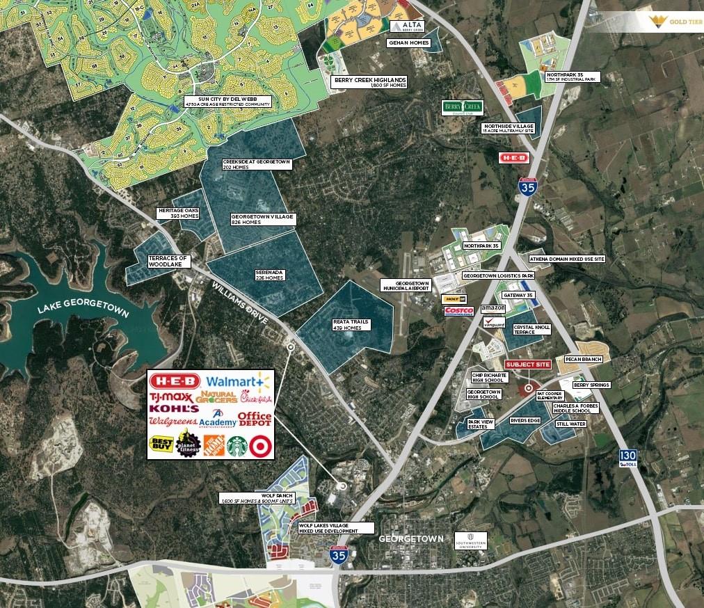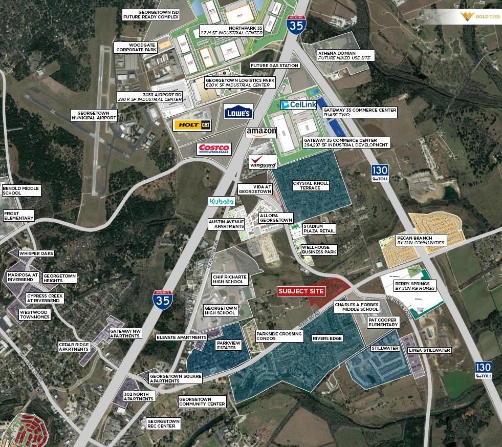 Gold Tier Real Estate is proud to present +/- 17.93 acres for sale in the heart of Georgetown. With easy access to IH-35 or Toll 130, this site is well located to take advantage of all Georgetown has to offer, including new HEB, Lowes and Costco locations. The site has a 12†water line and 10†wastewater line nearby. The FLUM shows this site as a Mixed Density Neighborhood. Please inquire with the brokers for more details.