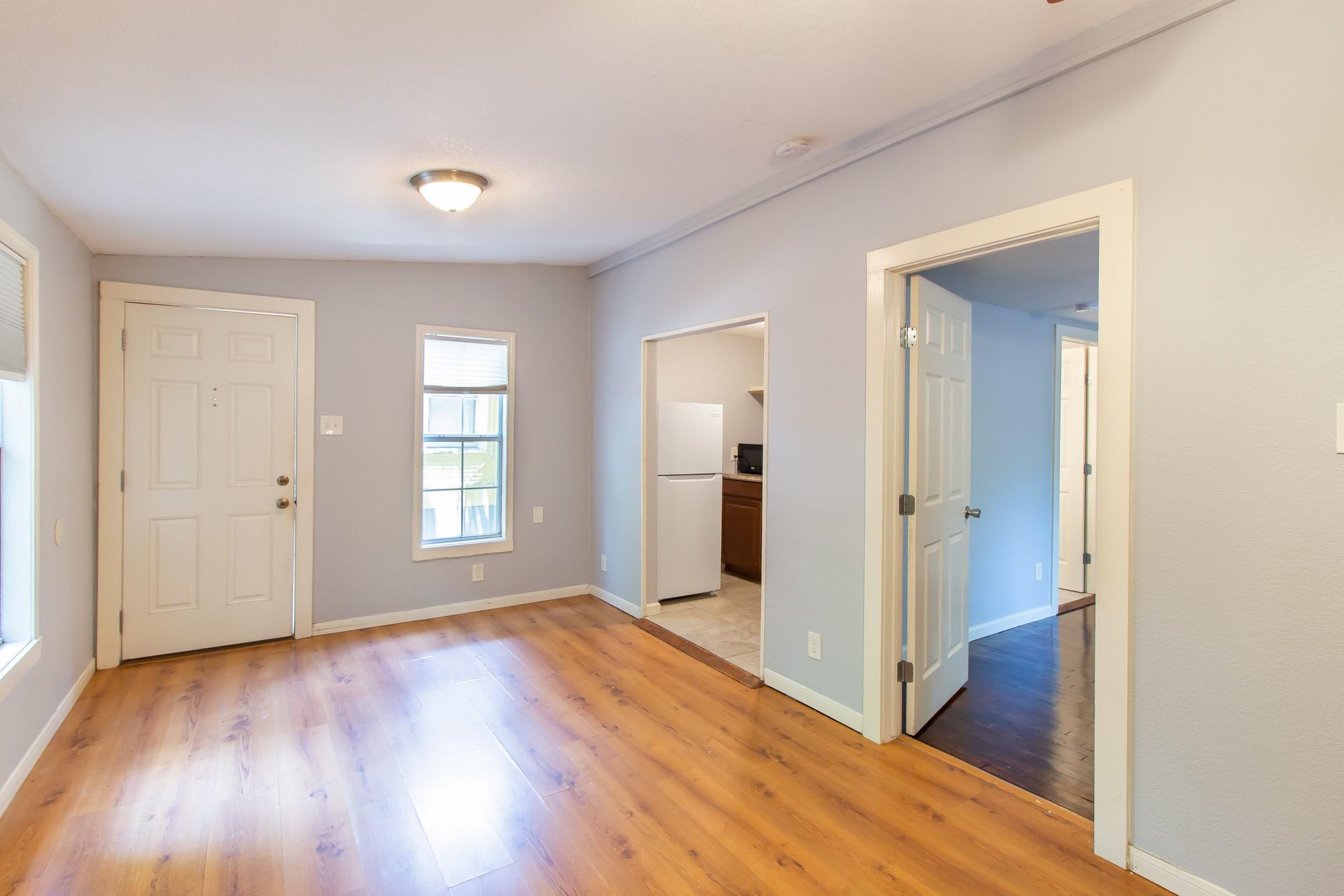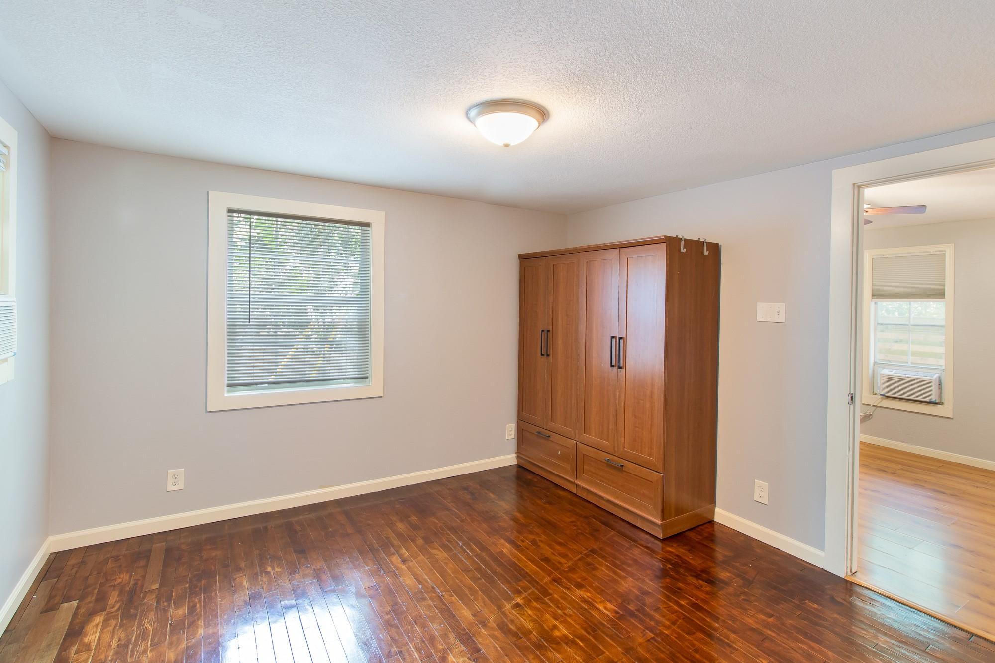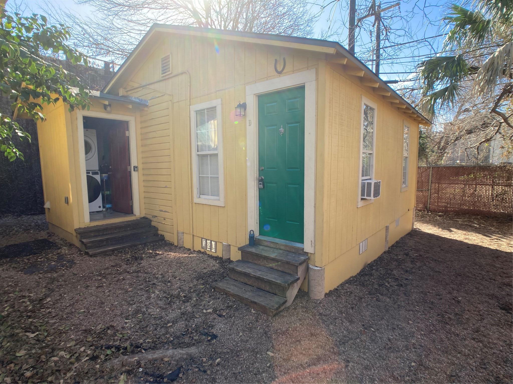 A stand alone place even though it's included in a 4-plex. Flat fee bills, except internet. Free standing closets in bedroom (even though they are currently stored off site). Updated bathroom. See photos for more information. Cat only, no dogs. Refinished hardwoods in bedroom, laminate flooring in living area. Washer/dryer shed right outside, shared with 4-plex. Flat fee utilities: 135/mo. Street parking. Driveway for loading/unloading/vendors
