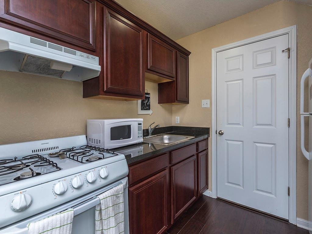 The bedroom, carpeted for comfort, provides a cozy retreat. Step into the well-equipped kitchen, adorned with dark wood cabinets that add a touch of sophistication. This apartment includes 1 bedroom and 1 bathroom, providing a cozy and functional living space.
