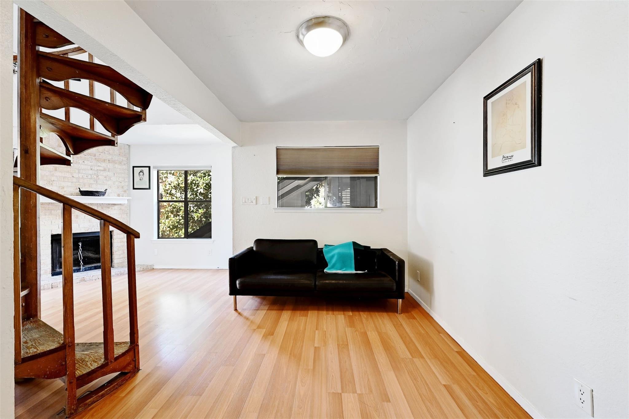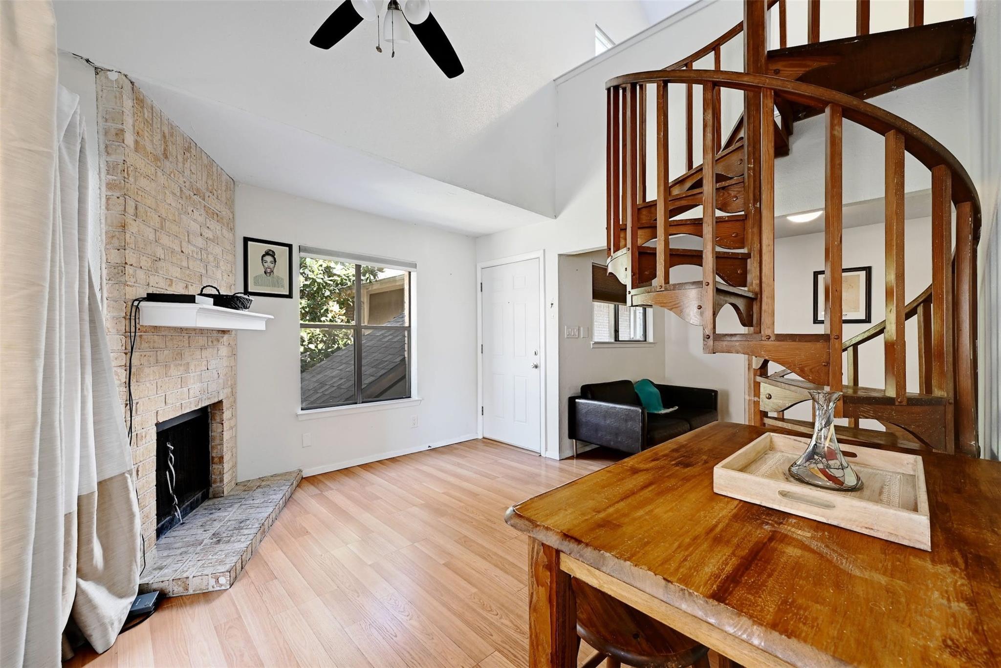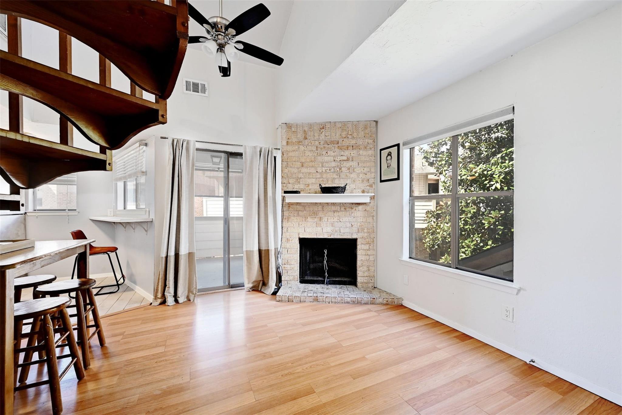 Available for immediate move-in! Remodeled 2nd-floor loft condo in Central/East Austin with a modern yet cozy vibe. Open floorplan, high ceilings, and ample natural light. Spiral staircase and wood-burning fireplace add charm. Chef's kitchen with updated design, shaker-style cabinets, and stainless steel appliances. Main floor has a full bathroom. Loft bedroom with walk-in closet and attic access upstairs. In-unit stackable washer/dryer for easy laundry. Private balcony with solar shade and pool view. AC replaced in 2021. Gated community with ample parking and a sparkling pool. Only 1/2 mile to Metro bus stop, short walk to Mabel Davis Park. Google Fiber available. Includes fridge and stackable washer/dryer. Featured on TLC's 90 Day Fiancé in 2024—currently in filming!
