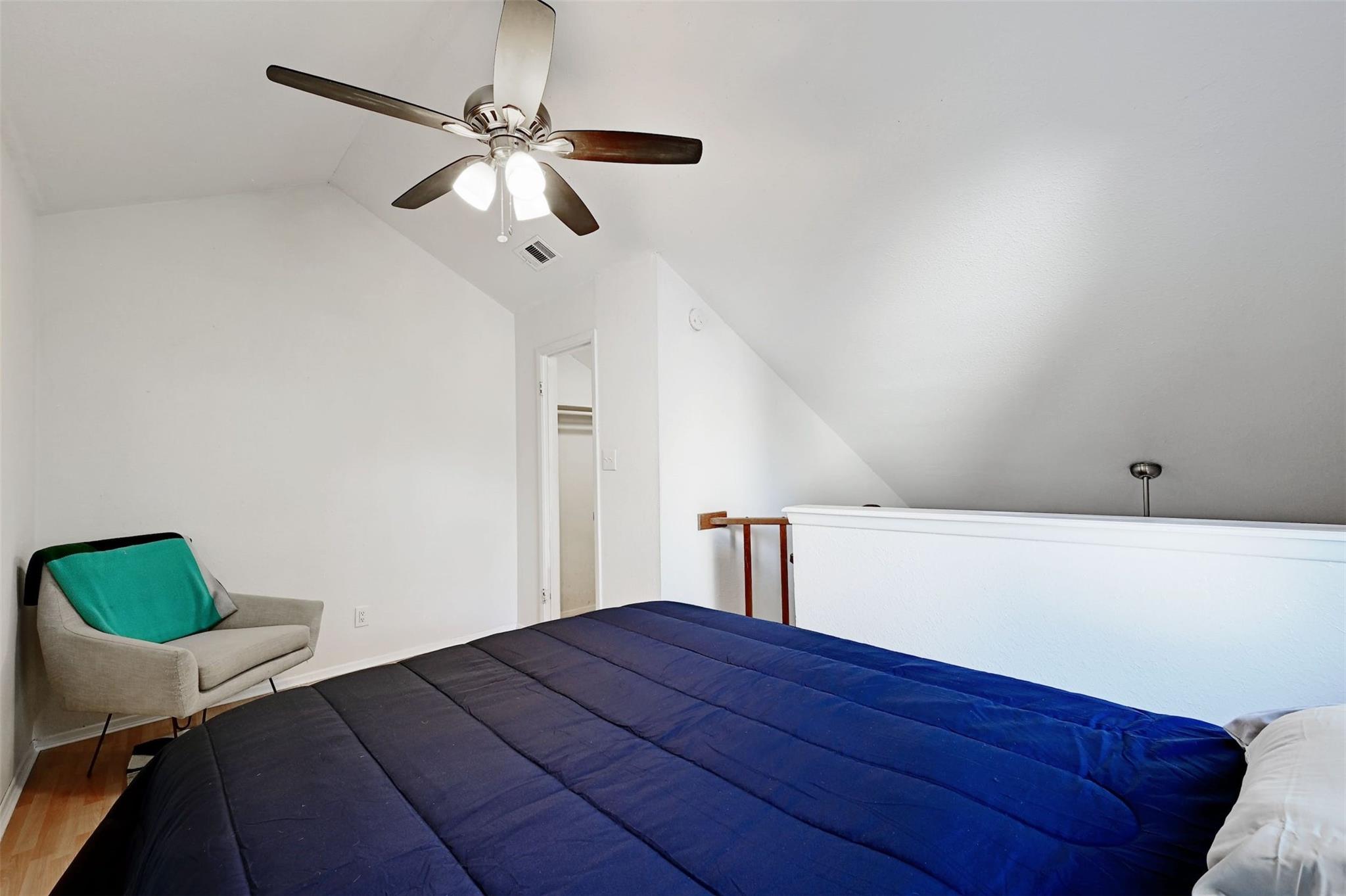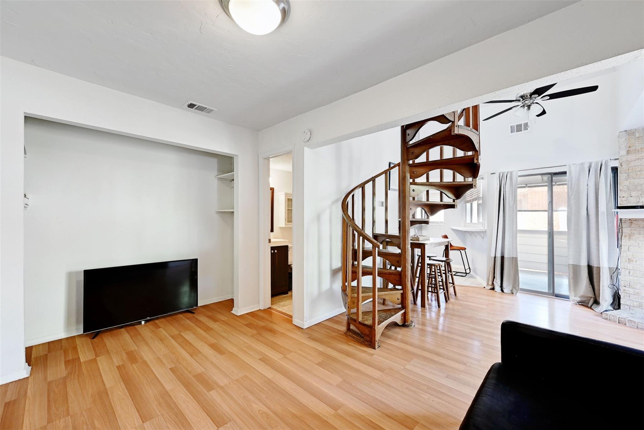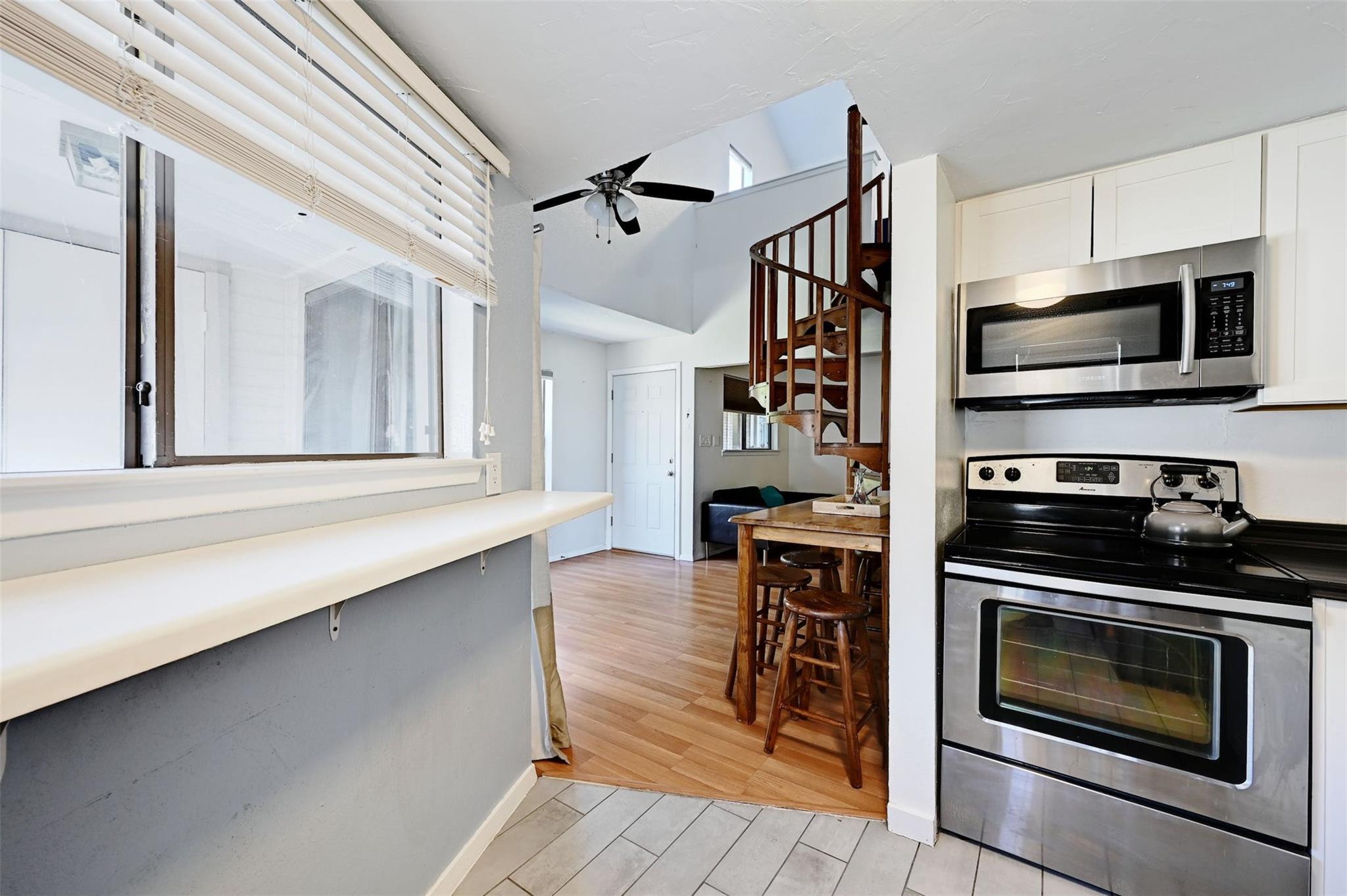 Available for immediate move-in! Remodeled 2nd-floor loft condo in Central/East Austin with a modern yet cozy vibe. Open floorplan, high ceilings, and ample natural light. Spiral staircase and wood-burning fireplace add charm. Chef's kitchen with updated design, shaker-style cabinets, and stainless steel appliances. Main floor has a full bathroom. Loft bedroom with walk-in closet and attic access upstairs. In-unit stackable washer/dryer for easy laundry. Private balcony with solar shade and pool view. AC replaced in 2021. Gated community with ample parking and a sparkling pool. Only 1/2 mile to Metro bus stop, short walk to Mabel Davis Park. Google Fiber available. Includes fridge and stackable washer/dryer. Featured on TLC's 90 Day Fiancé in 2024—currently in filming!