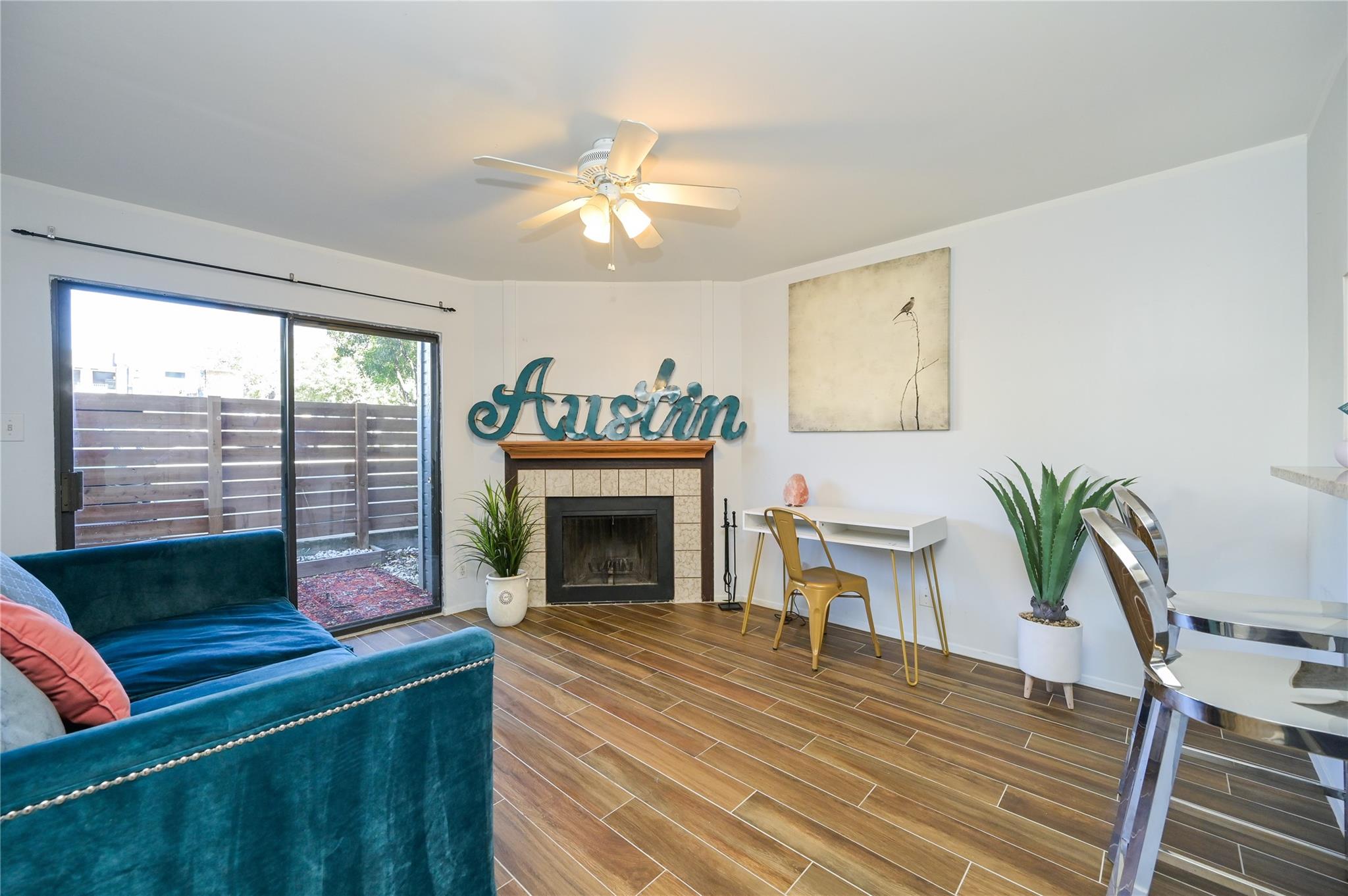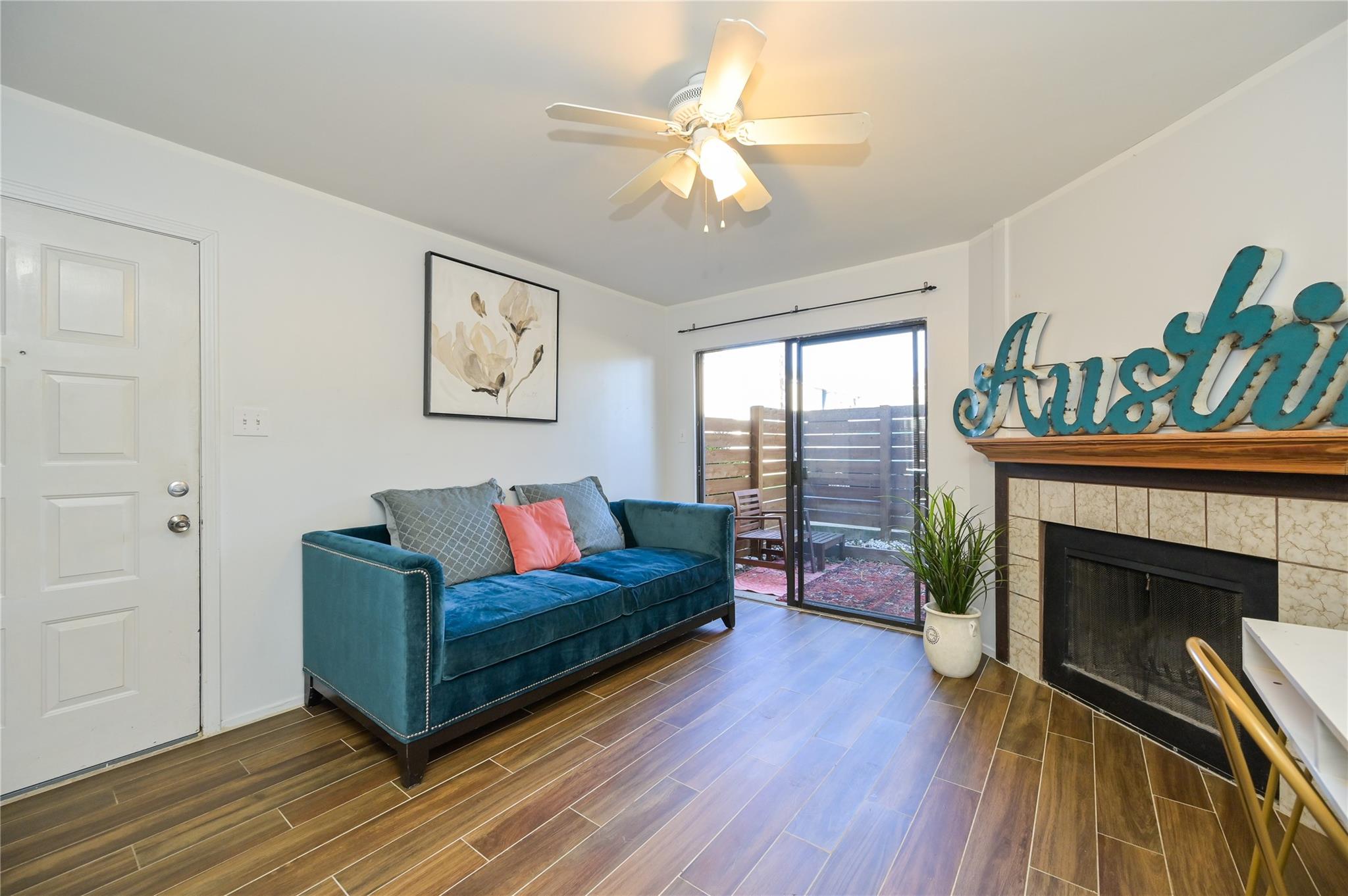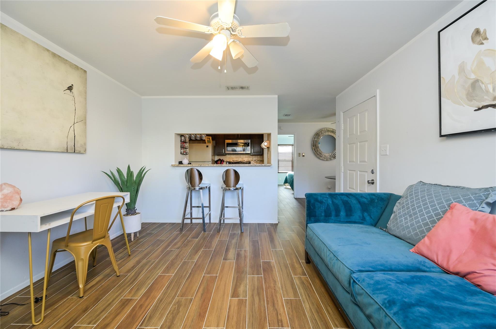 Updated first floor condo with a washer dryer in the bathroom. Wood look tile throughout and fenced yard area. All pets are negotiable under twenty pounds. Looking for a one year lease but short term furnished rental possible.