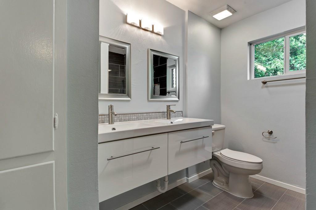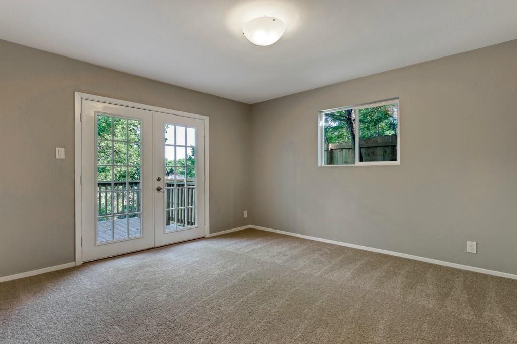 Beautifully renovated 2 bedroom duplex in South Austin available now. Enter into the warm living area complete with cozy fireplace and open concept to accommodate a number of design layouts. The kitchen has a breakfast bar, stainless appliances, timeless white cabinetry and subway tile back splash. The bathroom has dual sinks, modern fixtures and tasteful tile accents. Two ample sized bedroom separated by the bathroom perfect for a roommate or a home office. The primary bedroom offers French doors to the backyard deck with stairs trailing down to the tree lined yard.