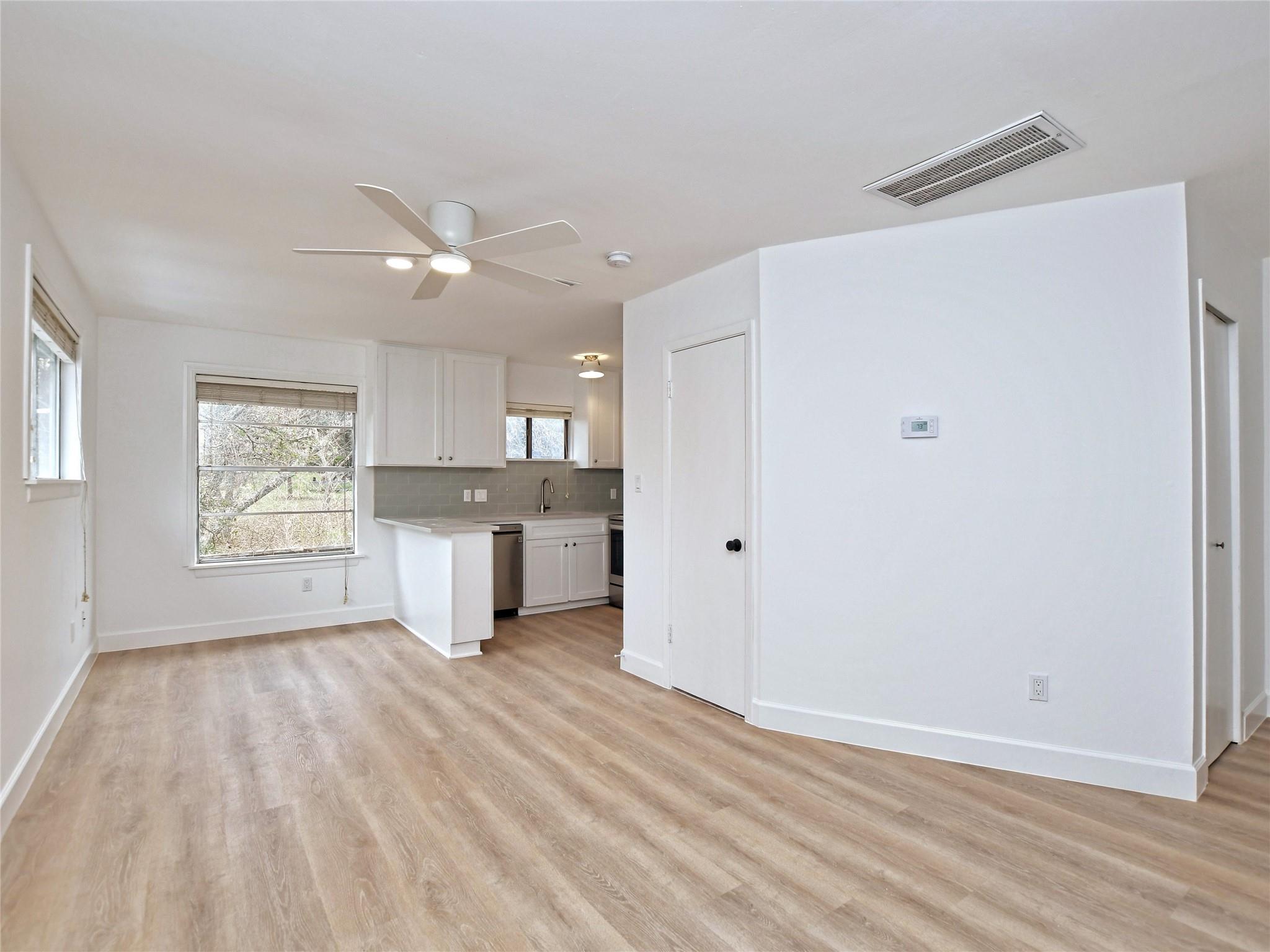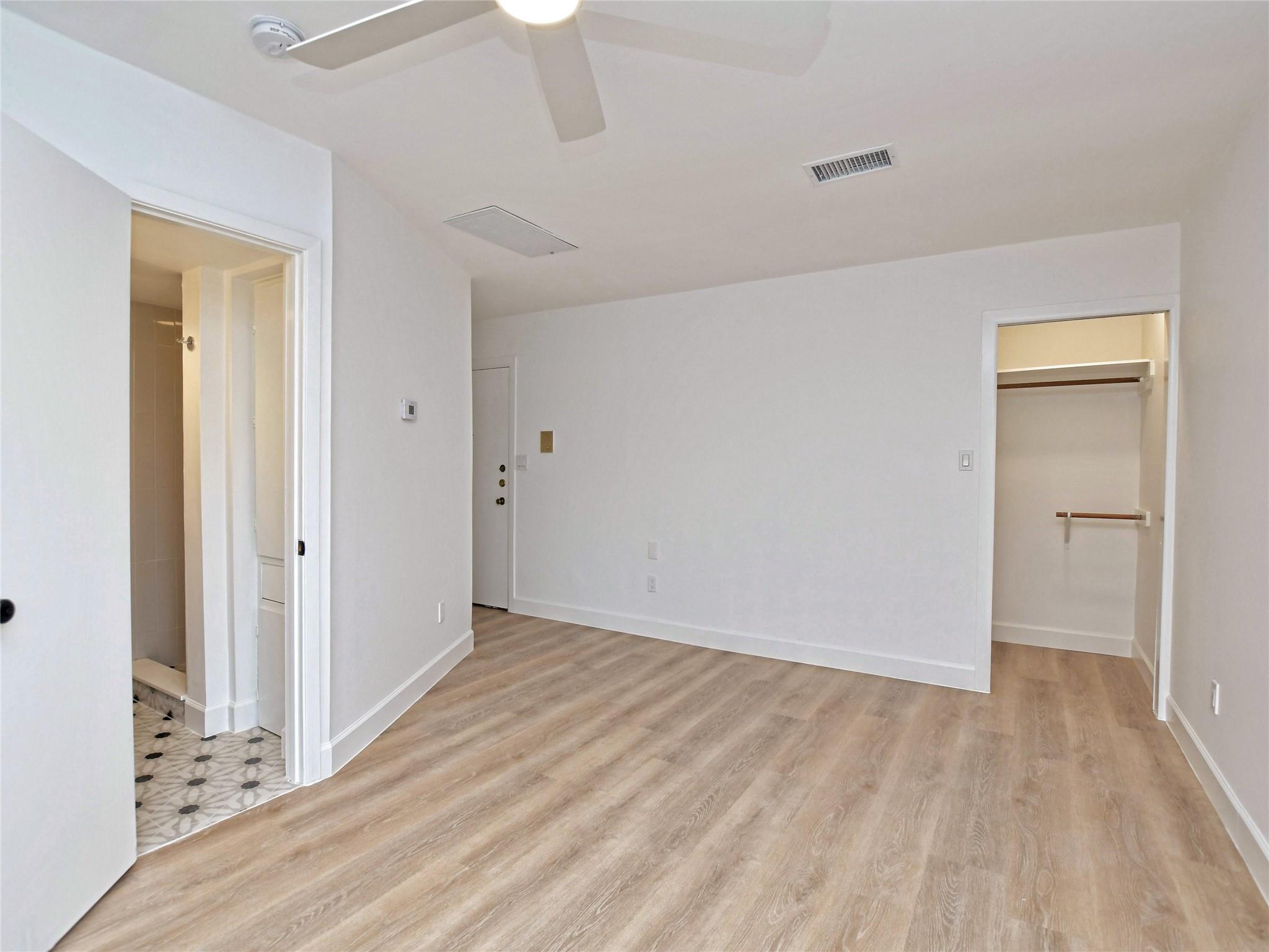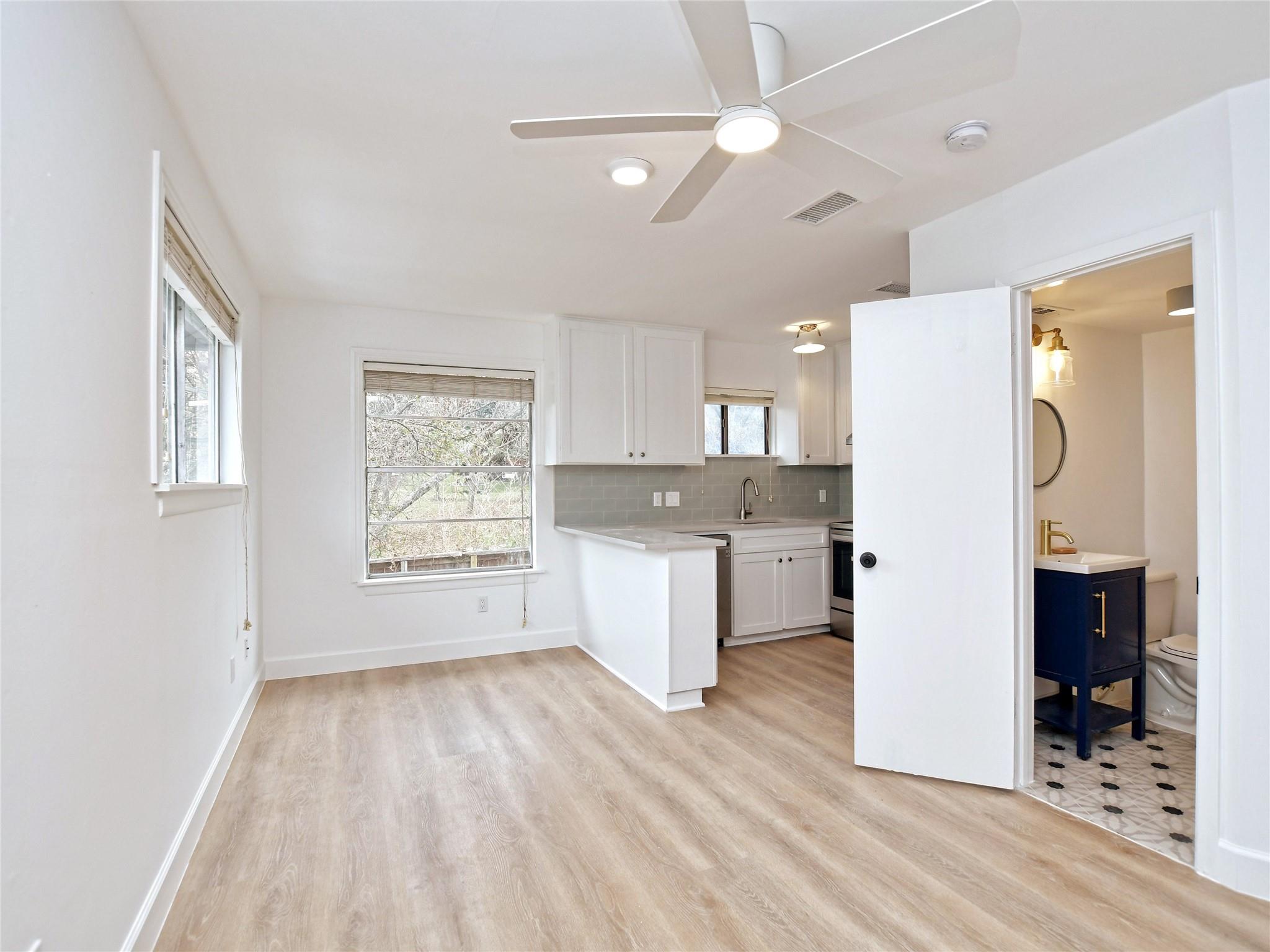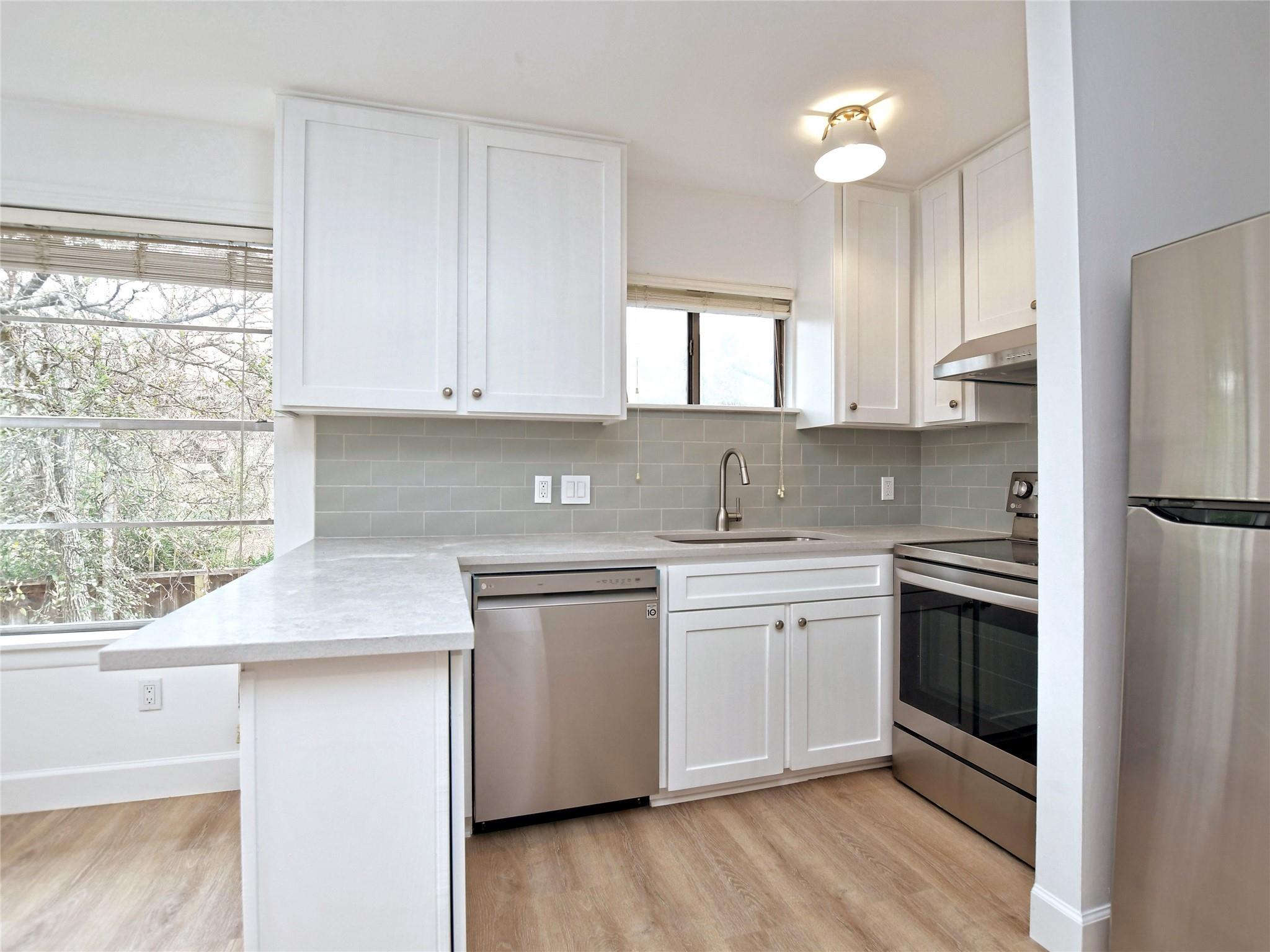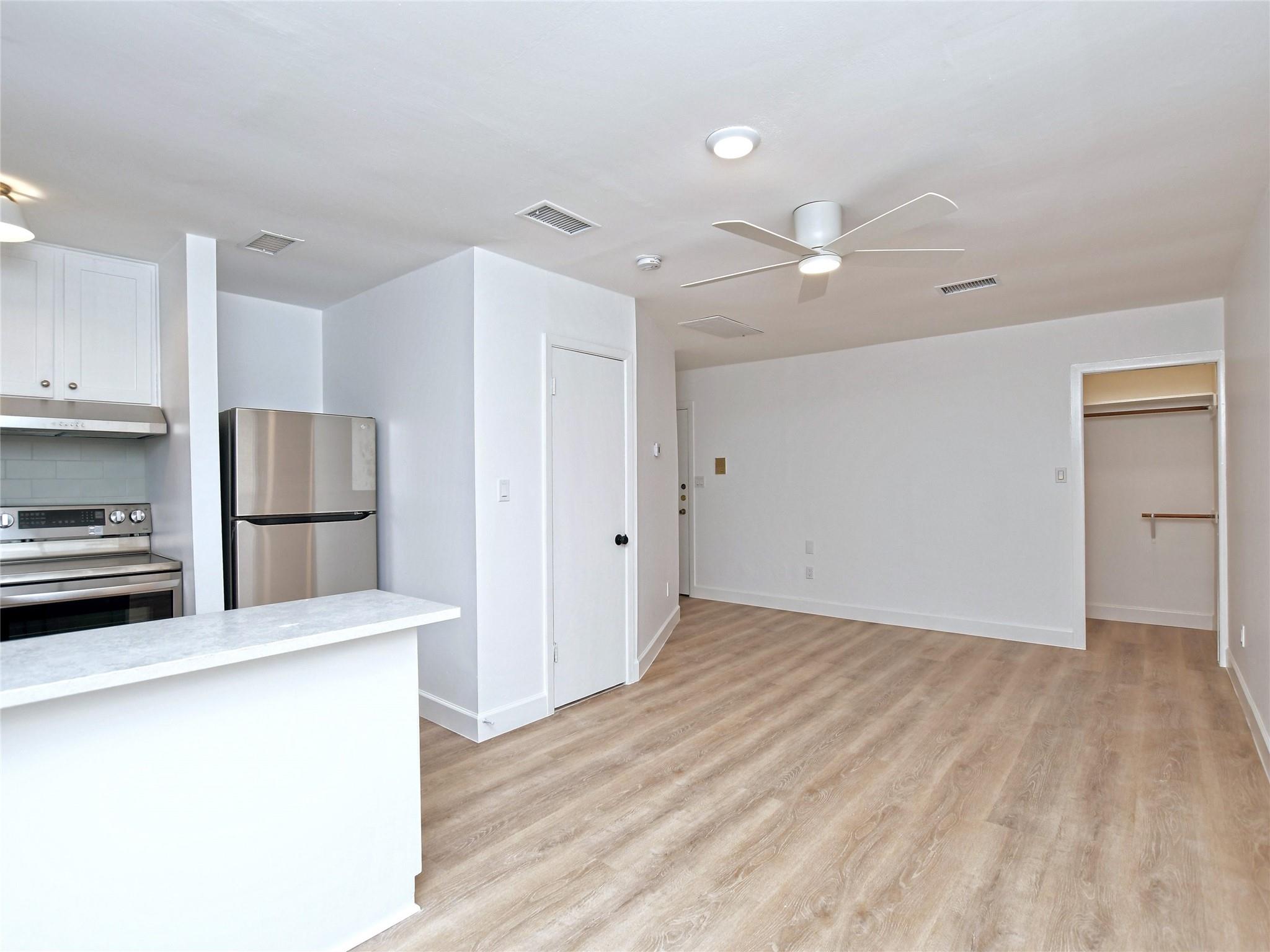 Boutique 9-unit, renovated apartment building on a quiet, tree-laden cul-de-sac located just off amenity-rich South Lamar. This spacious corner unit includes beautiful new vinyl plank floors, high-quality custom countertops, new stainless-steel appliances and a spacious, beautifully-tiled bathroom. Pet friendly community with no monthly pet rent. Allocated water. Landlord pays for pest control. Electricity with City of Austin.