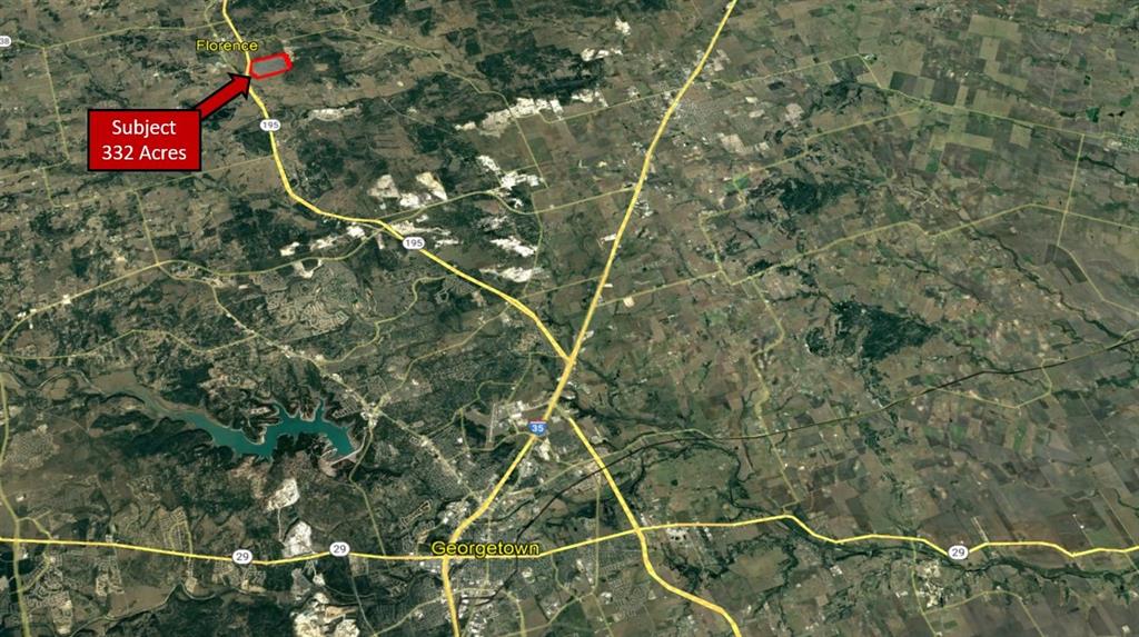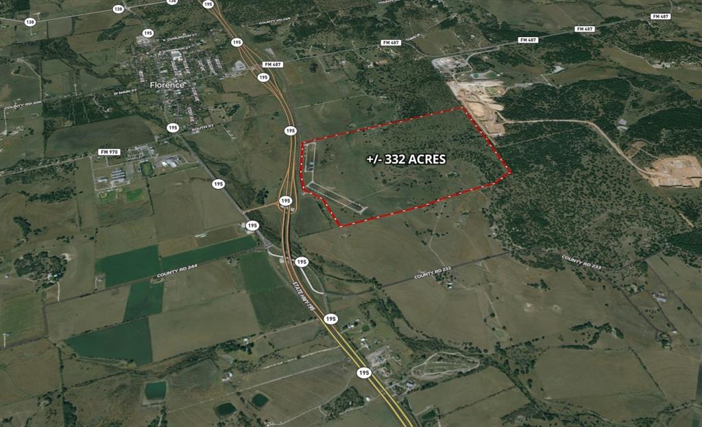 NEW to market 332-acre ranch with gentle, rolling topography, beautiful live oaks, multiple stock tanks and well-maintained open spaces. 1,700+ feet of frontage on Hwy 195 feeder road. Outside the city limits of Florence, TX and inside Williamson County.